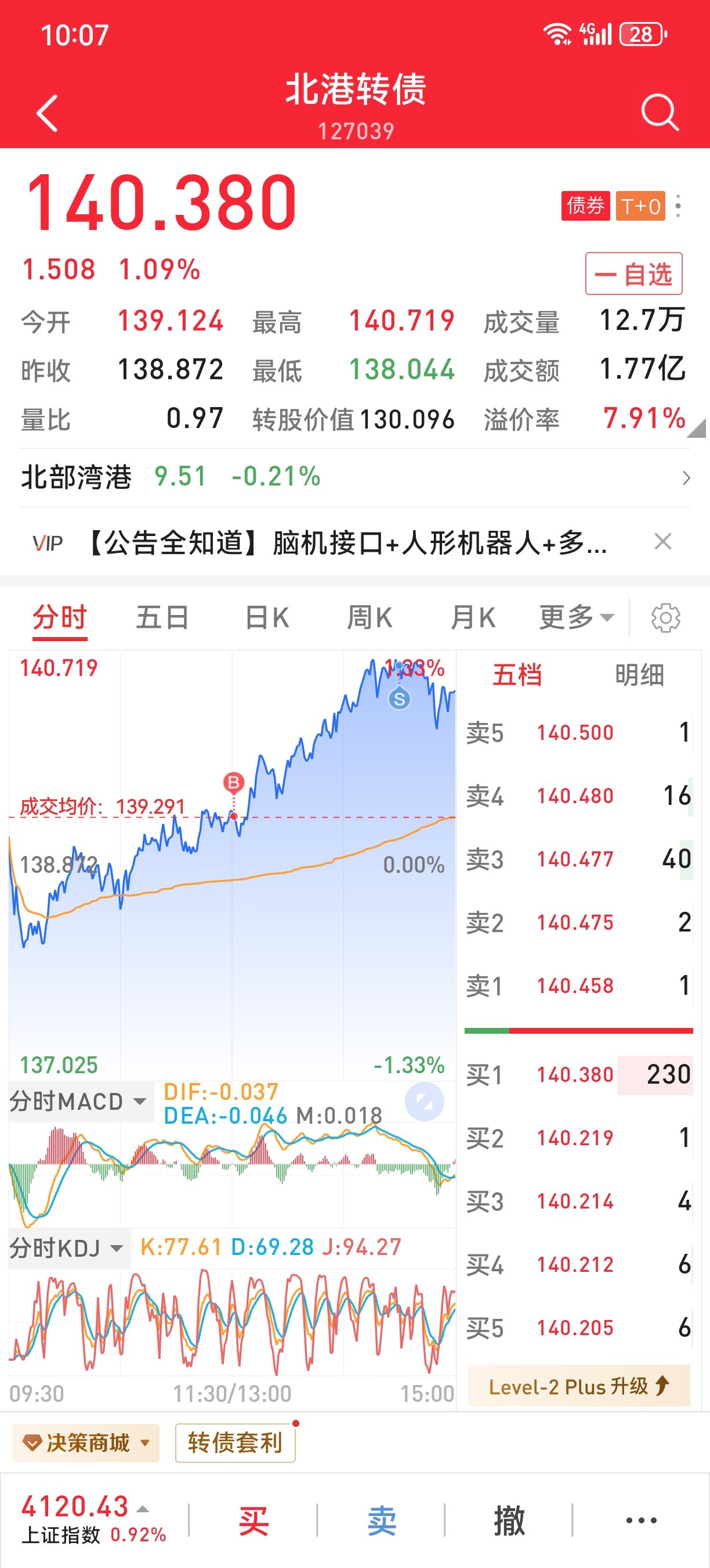 干了首华凤21,把北港放生了我也是上了这两个,这两个溢价率低,正股在强赎线附近,一个满足两天,一个三天。10天做t也能把成本做到130以下吧。如果中间稍微波折一些,给做t的时间更长些。昨天的嘉元一度也跌到137了,可惜现在又上了140以上了。如果行情转熊,正股可能跟随大行情跌,强赎不了,转债反倒可能涨。如果行情转好,市场情绪好,溢价率完全有可能涨上去