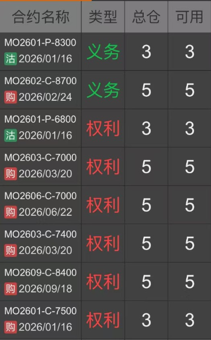解释一下 账户持仓中 : MO2601-C-7500 持仓逻辑: 他是在指数7600点时 根据海龟策略买入的。 如果海龟信号存在,到月 重新开仓。 如果指数大跌,他就损失权利金。 下月就不开仓了。