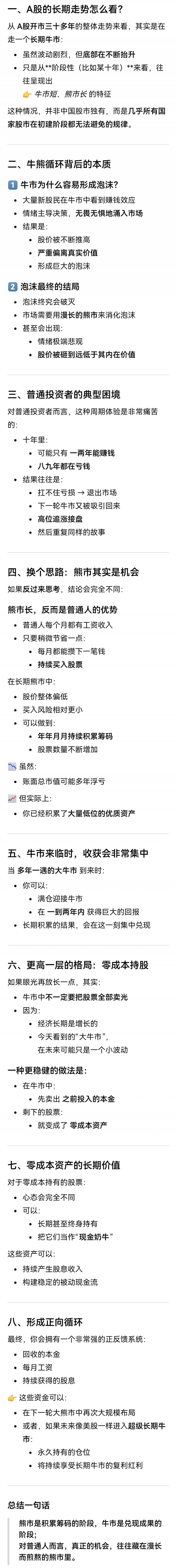 有道理 可是股市的玩家感觉国家的掌控力明显不如房市 想要形成长期趋势还是太难了要看A股开市三十多年来的走势,其实也是在走长期牛市的,因为它的底部在不断的抬升;只是它阶段性某个十年来看是牛市短熊市长的;不过这也是任何国家的股市初建时无法避免的情况,大量新入市的股民在牛市看到赚钱效应时,无畏无惧的往里冲,造就了牛市产生巨大的泡沫,股价远远超过其价值,最终泡沫终会破灭,用漫长的熊市来逐渐消化泡沫,甚至股价又会被情绪砸到地板之下,股价远远低于其价值;这种体验对普通投资人来说,当然很不好,十年里面可能只有一两年能赚到钱,八九年都是亏的,亏的受不了就自然退出市场了;等到下次牛市吹出泡沫时,又被诱惑追高买入,高位接盘然后重复之前的故事;但是,只要改变思路,反过来想,熊市长才真正给投资者长期买入的机会,对于普通人来说,每月都是有工资入账的,如果节省一点,每月都可以攒一笔钱买入股票,因为在长期的熊市,股价普遍都不高,买入是相对安全的,这样年年月月,你能攒的股票数越来越多,虽然看总市值可能很多年都是浮亏的,但你却实实在在攒到了大量处于低位的优质资产;这样当多年一遇的牛市来临时,你可以满仓吃一个大牛市,所有的投资在一两年之内就给你带来了巨大的回报。当然如果足够有格局的话,其实牛市也不用全卖光的,因为经济长期在增长,现在看到的牛市在未来看来,可能仅仅就是一个小波动,你完全可以在这波的牛市把之前投入的本金先卖出来,那么所有的股票变成了零成本,对于没成本的资产,那还有什么害怕的呢?你完全可以抱牢一辈子,这些股就是你零成本的现金奶牛,它们每年都能给你源源不断的产出股息;你所有回本的本金,加之后每月的工资,加股息,又可以在下一个有可能到来的大熊市大展宏图了;当然也可能之后就没有大熊市了,出现如美股一般超级长期牛市也未可知,那么你永远抱牢的仓位就能吃到这超级长期的牛市红利。