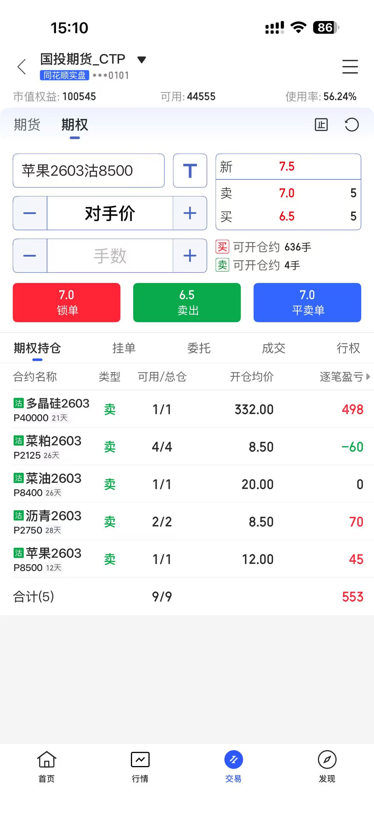 今天实盘:今天盈利40元左右。 今天有特殊操作就是平掉了大部的卖期权,原因是我要出钱去套利去了,现在套利机会太多了。 卖期权是很好的现金池,可以让我在有需要的时候随时移动资金出套利去,这个短时间的收益预期或者说是期望肯定比卖期权是要高不少的,但是机会很少。 卖期权在这个时候起到了很好的我的现金增强的作用。 今天我是转了8万出去,后面当我套利结束,我将转8万回来。