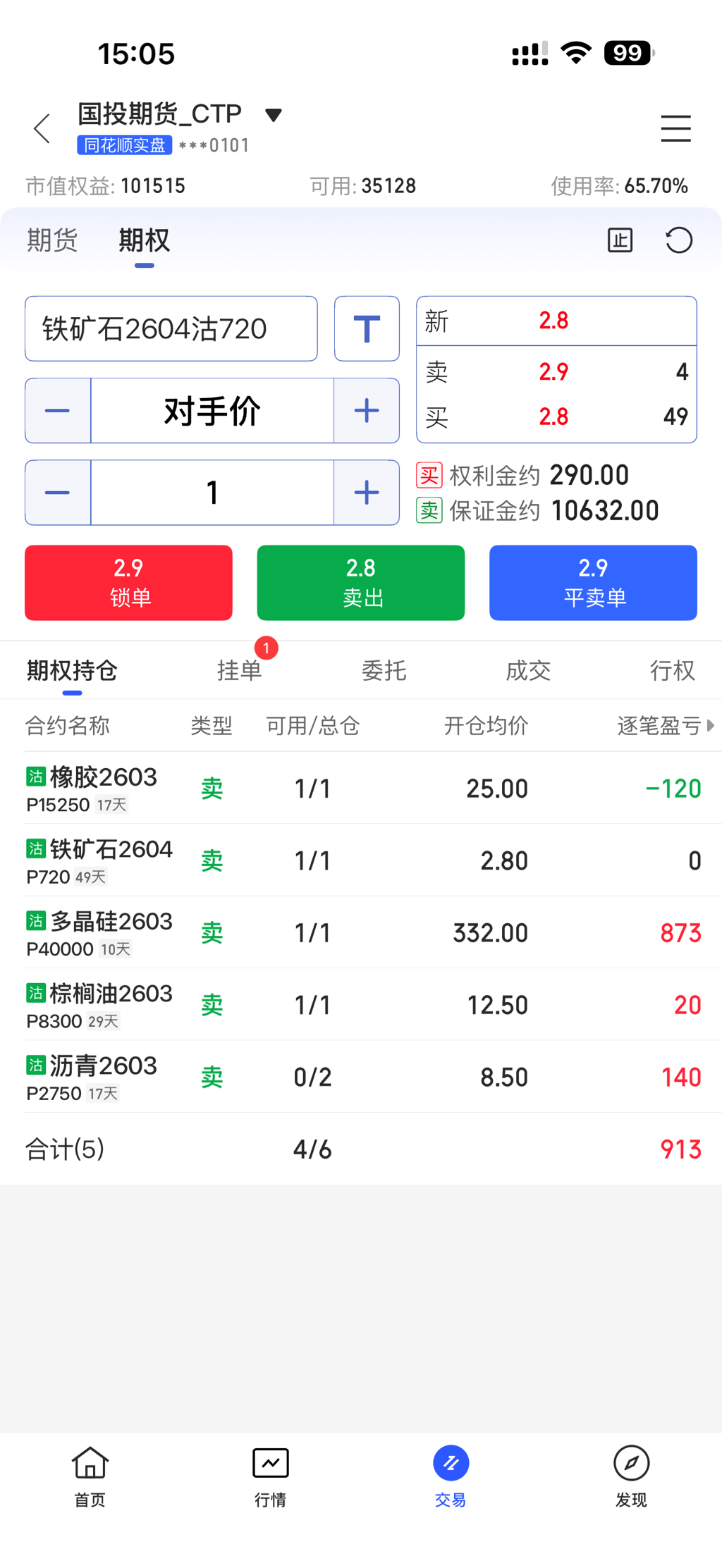 今天实盘:今天以10-20元的价格平了2个时间价值非常少的,都是提前挂单平的。 然后新卖了3个。