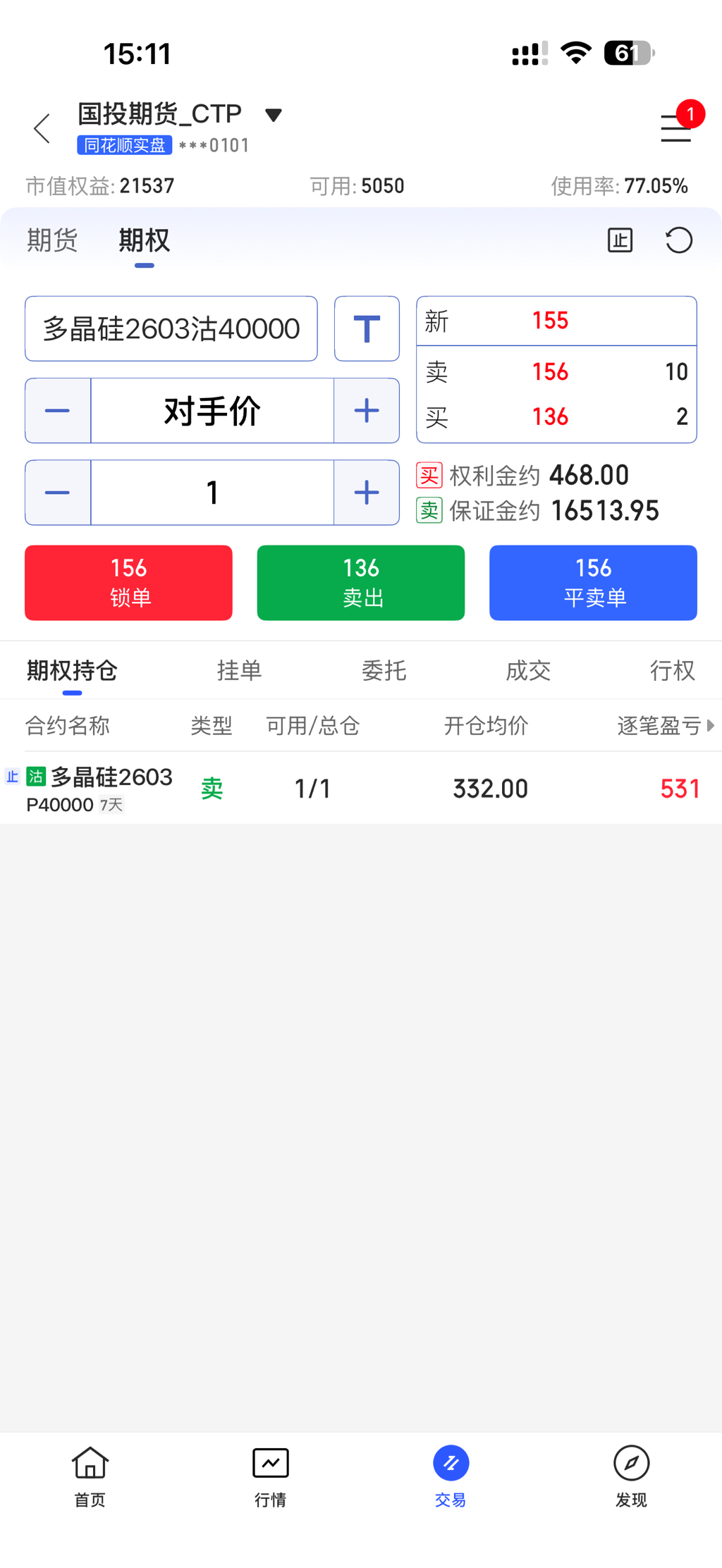 今天实盘:今天亏损320元左右。今天为什么亏损,因为持有的多晶硅大跌了,不过还有15%左右才到行权价左右,还有7天时间。 把止损单挂上,不用慌,坚持执行9倍止损就行了。