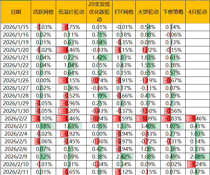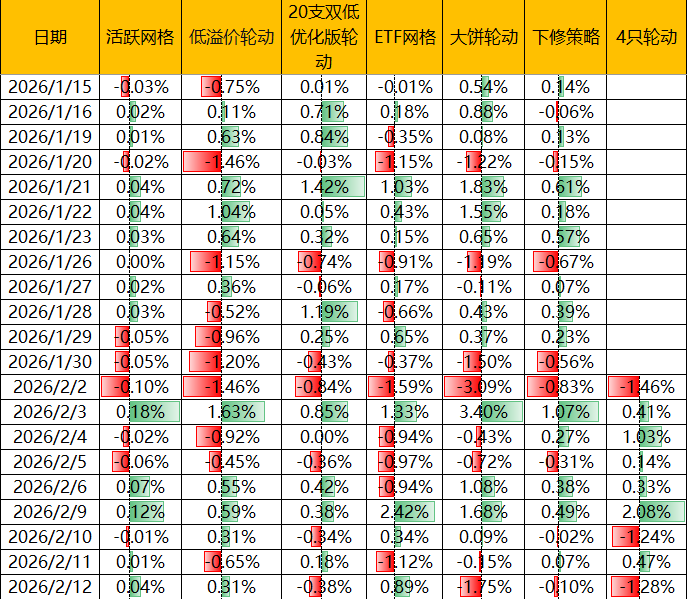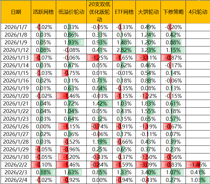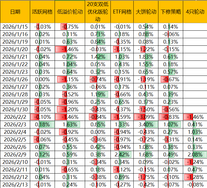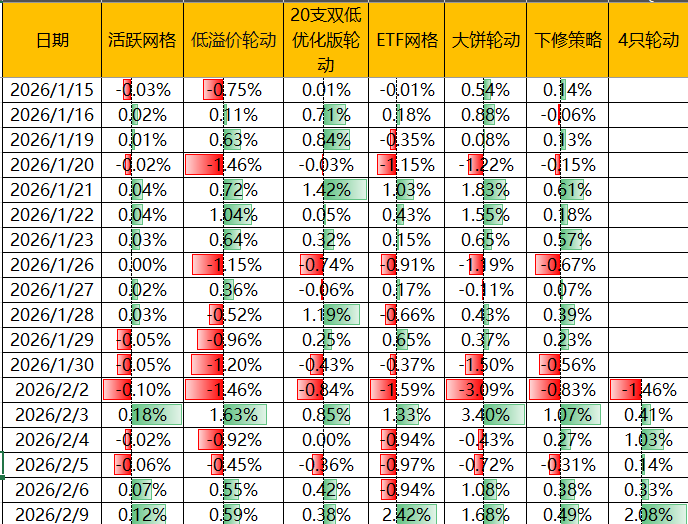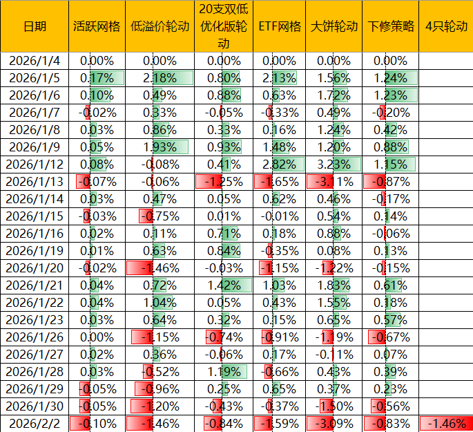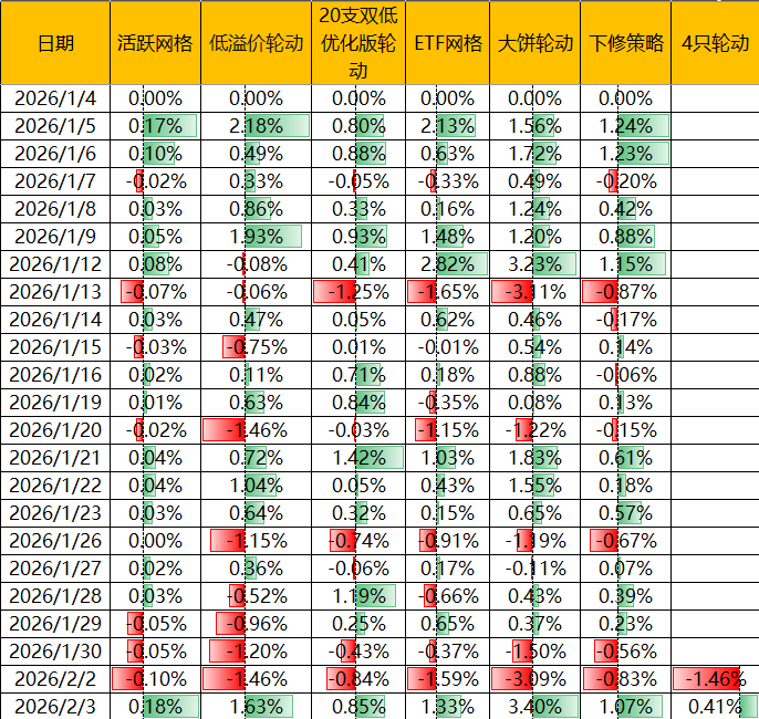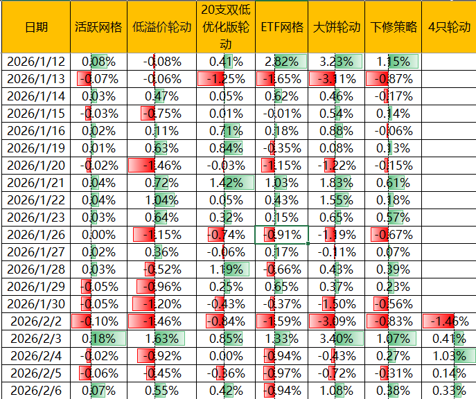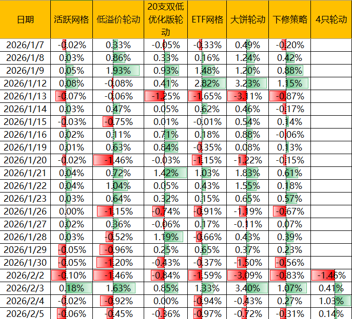 ①如果是单独账户,记录净值相对简单,因为可以默认软件显示的日涨跌,就是当日的策略涨跌幅度,比如涨1%,净值就从1变成1.01;我有2个账户是属于上面的情况,分别是活跃网格和低溢价轮动账户;