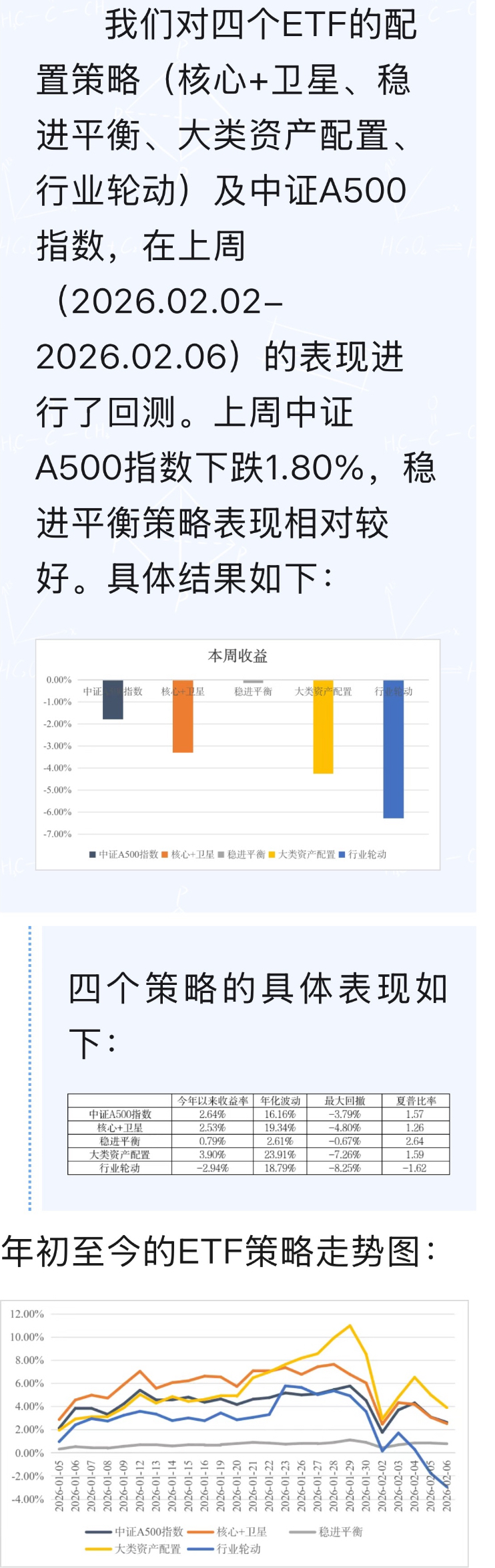 一、“核心+卫星”策略建仓及调仓方法:组合基日为2025年12月31日,组合仓位的55%配置A500ETF作为核心资产、剩余45%配置3个行业ETF(创新药、消费电子、科创芯片)作为卫星资产。定期每季度对组合进行再平衡调仓,保持比例恒定。当某一卫星仓位自建仓日以来盈利20%时卖出1/3,盈利30%时卖出剩余部分1/2,盈利40%时全部卖出,卖出资金适时调整到其他卫星资产。
