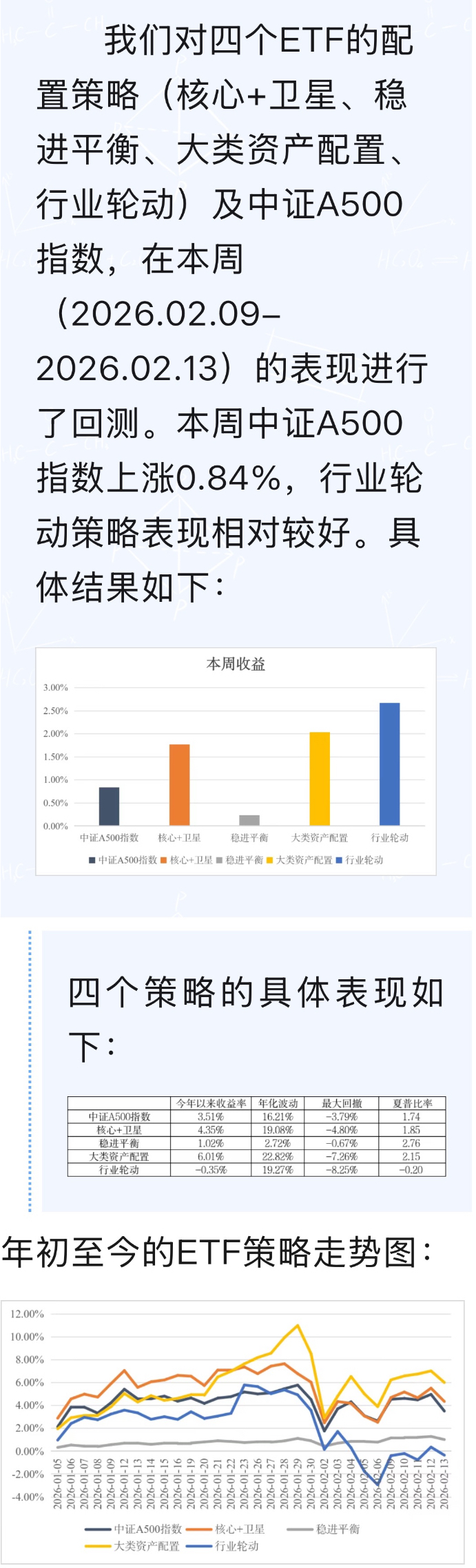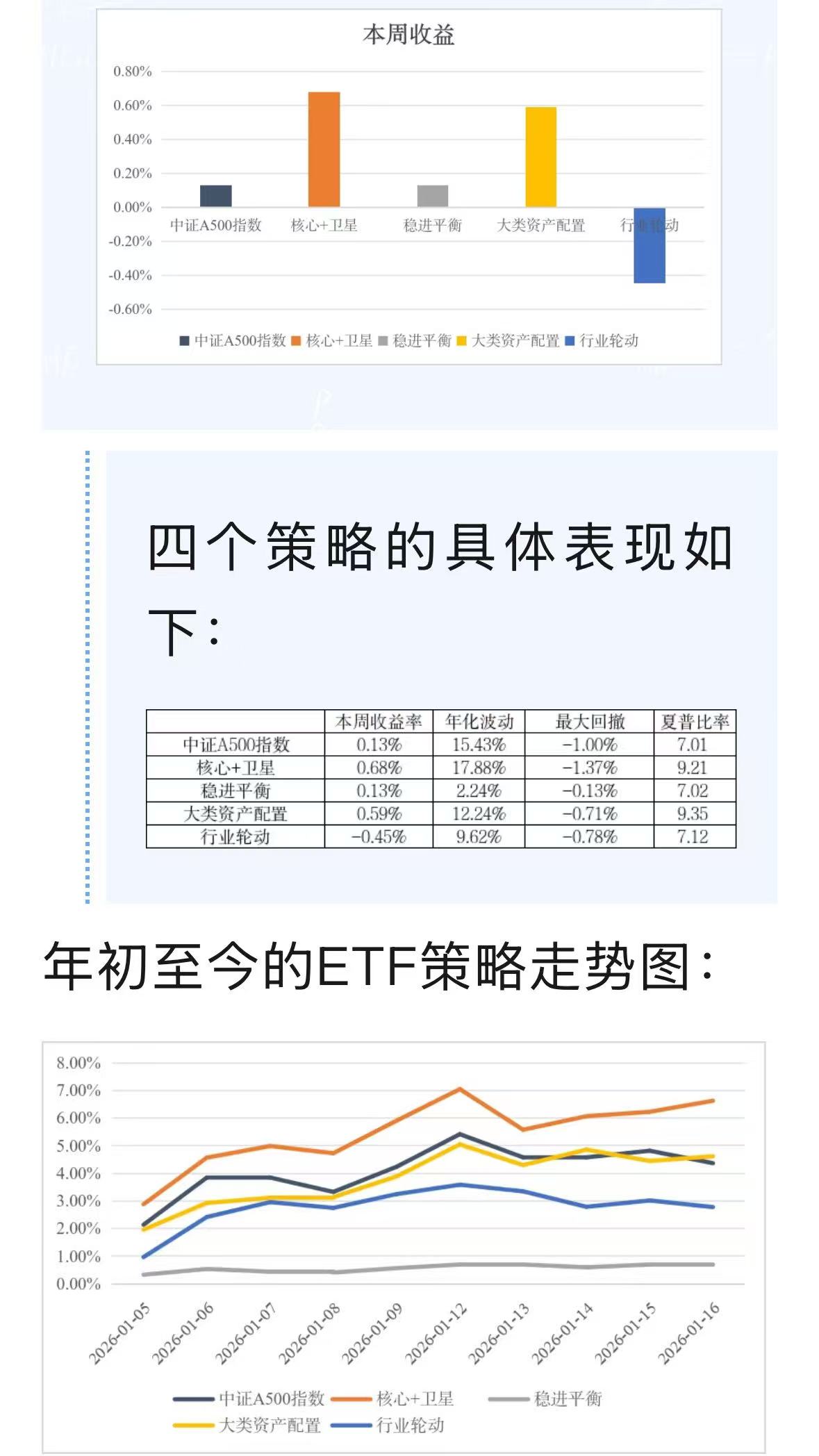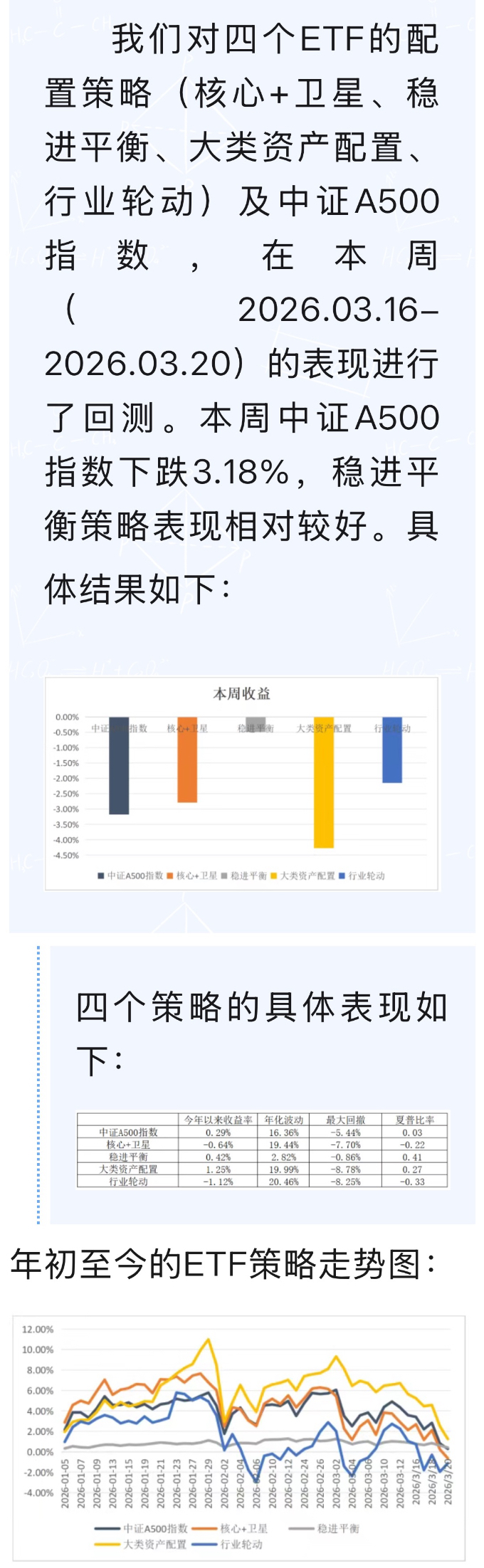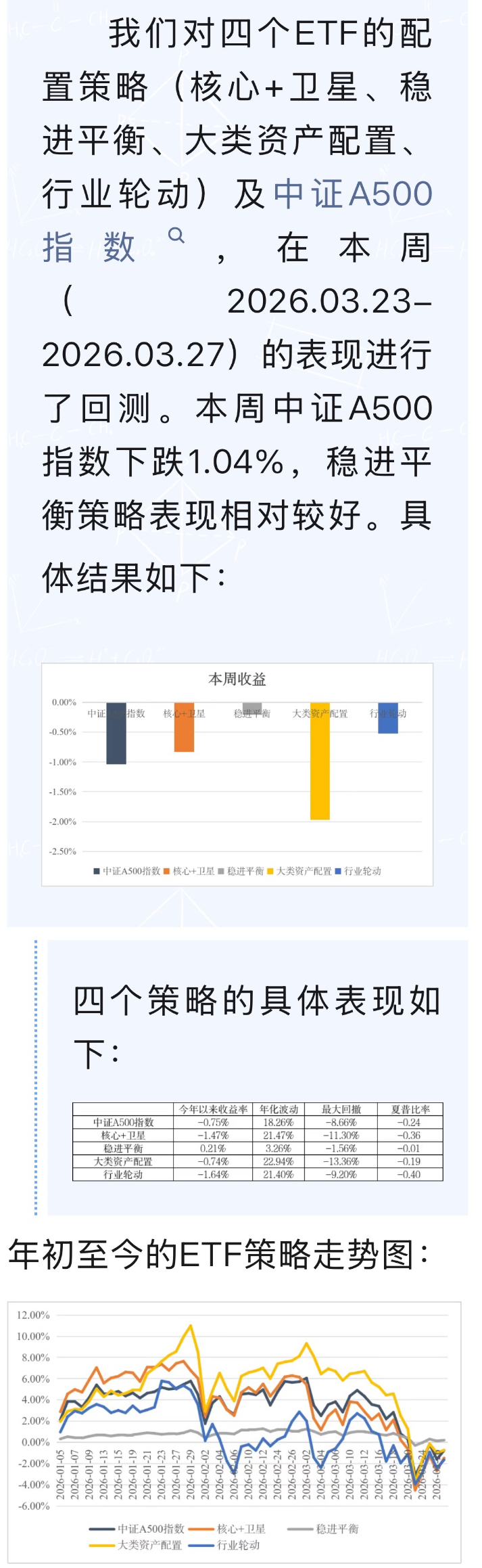 上交所对四个ETF的配置策略(核心+卫星、稳进平衡、大类资产配置、行业轮动)及中证A500指数,在本周(2026.01.12-2026.01.16)的表现进行了回测。本周中证A500指数上涨0.13%,核心+卫星策略表现相对较好。