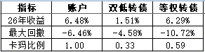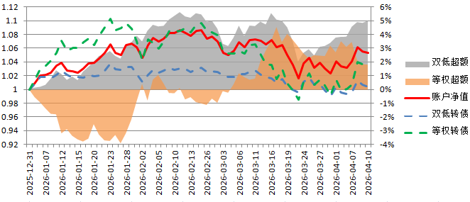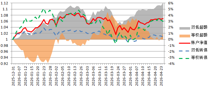 账户2026年累计涨幅6.54%,本周涨幅3.40%;万得可转债双低指数2026年累计涨幅3.75%,本周涨幅1.97%,年内累计超额2.79%。