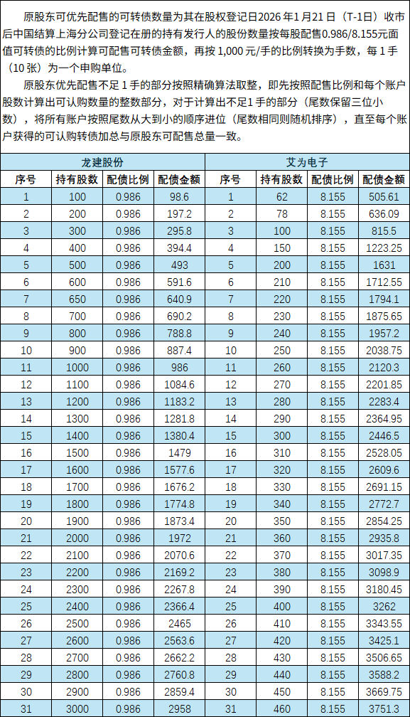 操作举例:龙建转债、艾为转债,2026年1月22日发行。上海市场“一手党”:按照配售比例估算“一手党”股数,假设600股龙建股份可配10张龙建转债,利用名下“3+1”个沪A/沪信用股东号各买600股共配40张,使用资金约12000元。上海市场“一手党”:按照配售比例估算“一手党”股数,假设100股艾为电子可配10张艾为转债,假设201股艾为电子可配20张艾为转债,利用名下“3+1”个沪A/沪信用...艾为应该是600股配4手吧?