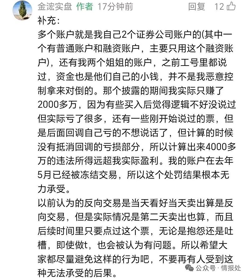 还是摊大饼大法好啊。散户摊大饼就不容易被大V收割,大户摊大饼就不容易被监管盯上。PS:网传朋友圈截图如下,这位老哥很可能并没有赚到那么多钱,这下估计是彻底返贫了。只赚了2000多万?这人被罚一点不冤!