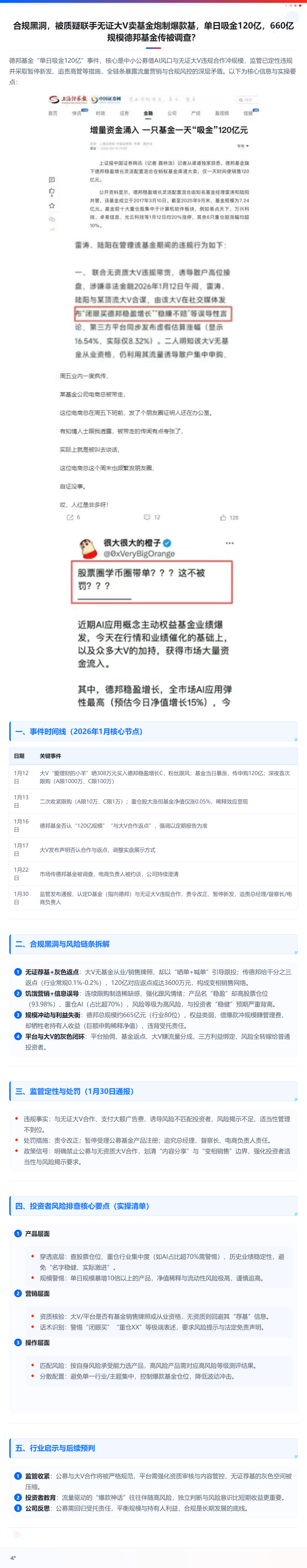 针对此前市场传言“某基金公司管理的基金产品单日申购量超百亿”一事,监管部门核查结果正式公布。证监会下发的2026年第一期机构监管情况通报指出,D基金公司与不具备基金销售及从业资格的互联网“大V”合作,利用其流量和影响力鼓动投资者跟风买入,诱导了风险承受能力不匹配的投资者购买中高风险产品。目前,监管对该公司采取责令改正并暂停受理公募基金产品注册的监管措施,同步追究公司总经理、督察长、互联网业务部门负责人等责任人员责任。这也成为新规下首个被点名的典型违规销售案例。(第一财经记者 曹璐)(本文来自第一财经)