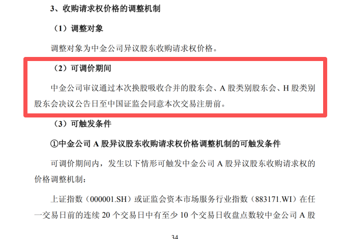 34.8是中金公司的异议股东选择权的价格,作为股东你可以在股东大会投反对票,这样如果最终换股成功了,你可以以34.8的价格把股票卖给大股东。那么为了保证股东大会通过,理论上股票价格要高于34.8才行请问楼主,存在异议股东收购价格调整机制的情况下,为什么“为了保证股东大会通过,理论上股票价格要高于34.8才行”呢?