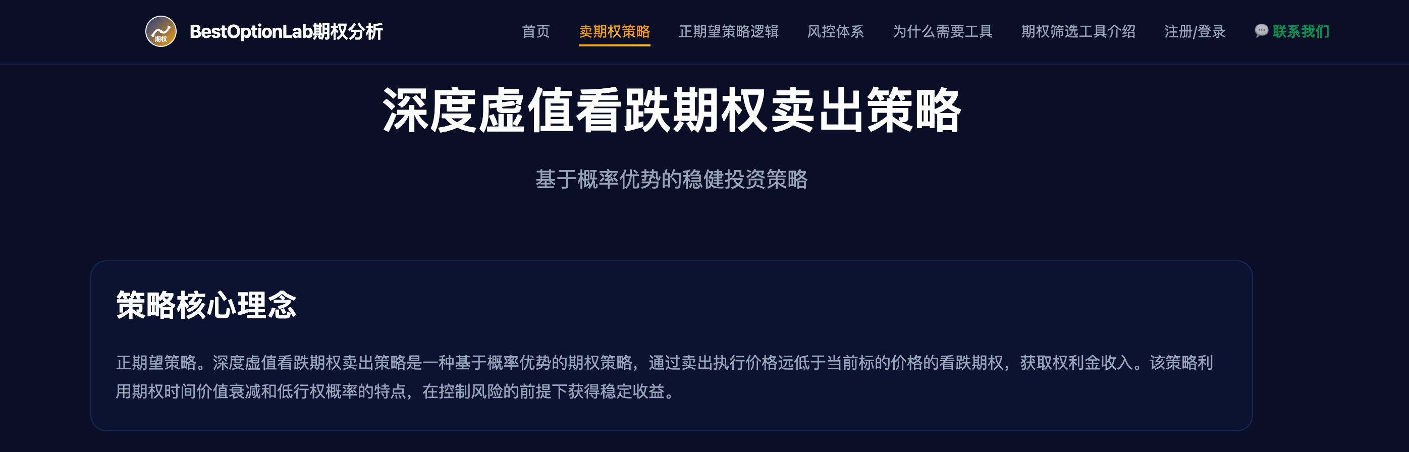 正期望策略。深度虚值看跌put期权卖出策略是一种基于概率优势的期权策略,通过卖出执行价格远低于当前标的价格的看跌期权,获取权利金收入。该策略利用期权时间价值衰减和低行权概率的特点,在控制风险的前提下获得稳定收益。以上需要在数学原理上证明是正期望,具体数学原理在产品中体现。