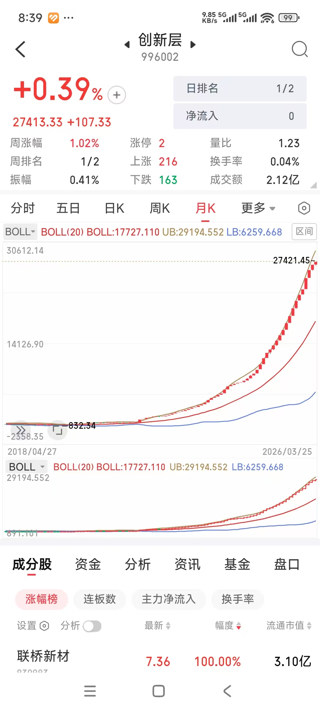 今天看到孔曼子老师算了老三板的指数,也看了下新三板的创新层指数,走势太漂亮了,完全是不间断的往上的样子,这个板块值得挖掘,在冷门中才会有好的收益,这个和B股一样。
