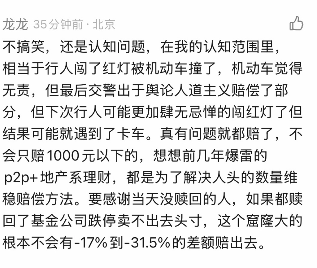 这东西该不该死我已经不想管了 死了就死了吧 我记得是世上已经全死了 当有人为了价值百万的微信号硬宣传这个的时候就已经死透了 但是我觉得这个经理才是大号散户 和我一样吓怕了 万一连续十个跌停卖不掉怎办 偶吼 赶紧瞎几把操作一下 只不过他是改净值我是赎回 事后看我们都是傻逼 但是呢 十年了 这个屌毛装了十年鸵鸟了 十年间啥特殊操作都没有过 我就不信他这么多年不晓得有羊毛薅嘛 他心里应该门清 ...假设净值真的会连续几个跌停,基金经理在第一天已知赎回量很少的情况下,还敢选择-17%给赎回者结算吗?或者说你要是基金经理你怎么办?