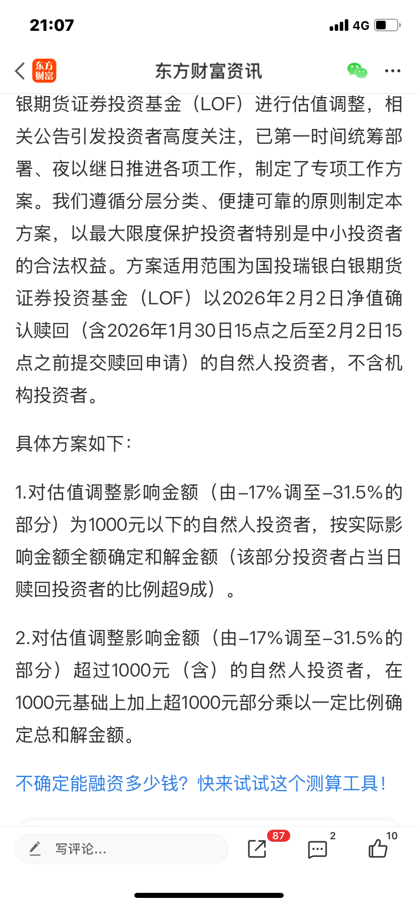 我认为方案和还算合理,就是不知道那天场外赎回多少?1000元以上的,这个比例是怎么定?
