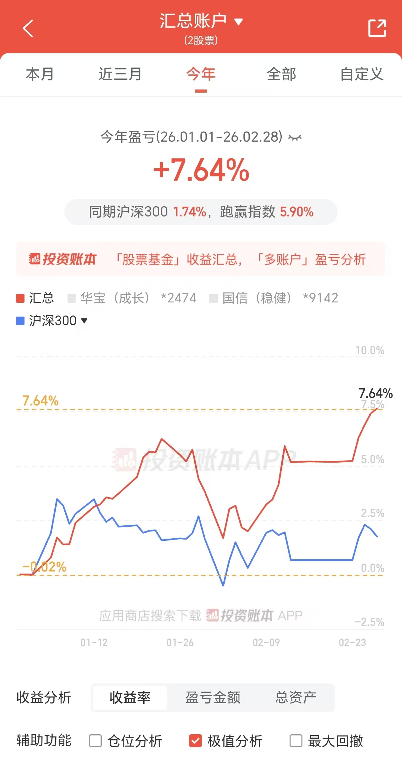 到2月末,今年收益率7.6%(含信用账户配债的收益大概8.1%),2月收益率3.7%,连续保持月度正收益,收益在最后一天创新高。