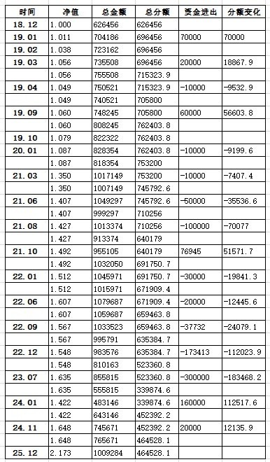 我一账户在2019年至2025年期间有16笔资金进出(尺寸受限隐藏部分数据),采用基金净值法计算每月的收益率,可以绘制账户月度净值变化和上证指数走势的曲线(将初始资金和2018年收盘的上证指数设为1)。七年时间账户净值从1至2.173,年均收益率16.76%,上证指数从1至1.591,年均增长率8.44%。