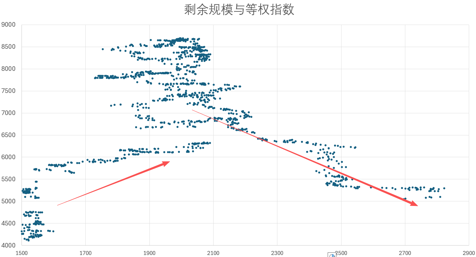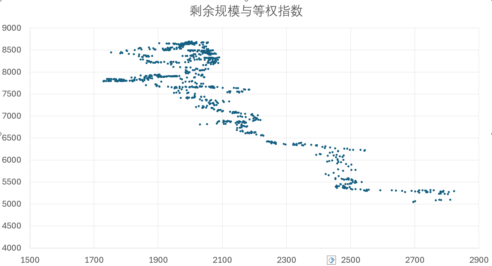 图中:横坐标为【等权指数】,纵坐标为【剩余规模】,每个点代表每日的数据
