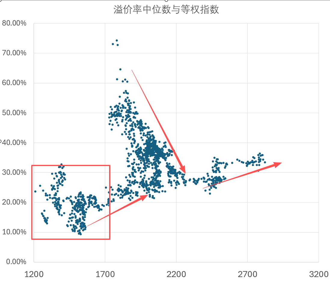 图中,纵坐标为【转股溢价率中位数】,横坐标为【等权指数】