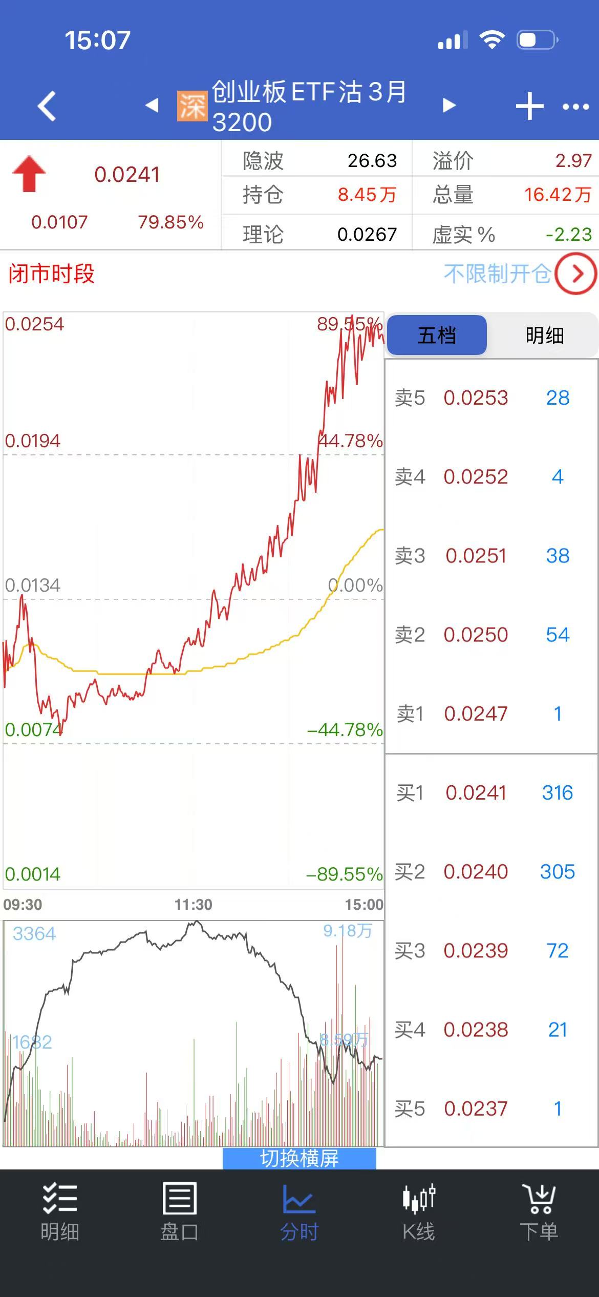 而且我大致计算了一下,能起到对应保险作用的期权份额应该是:虚值期权(要选择目前所对应的ETF的市场价格打95折左右那几个)购入金额=所买入对应标的物的etf市值*2%。我只是大概这么笼统的算了下。没有实际操作。等这几天空了,我就按照我计算的这个公式来买下试试。