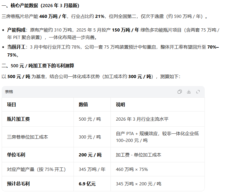 2、业绩起飞。公司25年瓶片扩产完成,目前加工费过千(回到21、22年水平了)。21、22年公司业绩好,主要是出口好,加工费比较高,23-25年业绩差,因为产能过剩,加工费太低了。最近加工费破千,如果持续下去,公司业绩会非常好。