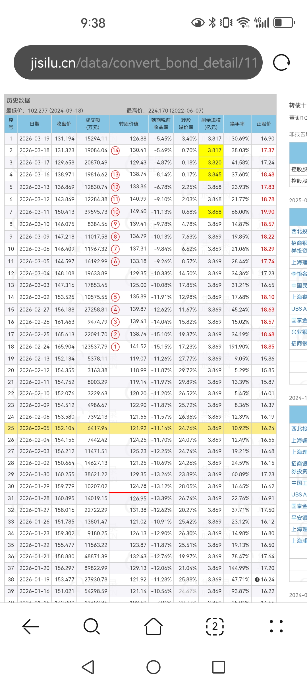 另外市场价格走势永远是对了,如果你不适应或者诧异市场走势,说明你的认知和理解没有到位,阿拉就是一支和大盘走势相反的可转债,当前转股价值接近130时没有什么参与价值,等转股价值降下来不满足强赎回条件的概率增大时才可以买进,如果你短线能力很强,可以利于规则反复撸短线差价(但一定要认知够执行强杀伐果断),如果没短线能力只能等大概率确定不能满足强赎回条件后再建仓(偏中线博弈的一定要等转股价值跌到125以下或者120以下)