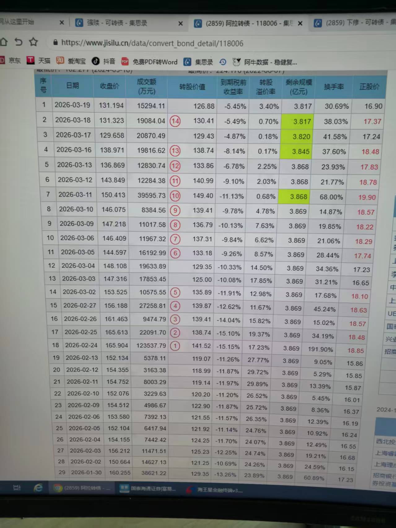 今日 阿拉 水羊 最快差一天满足可能强赎;今日 福莱 金23 冠宇 最快差一天满足可能触发下修。