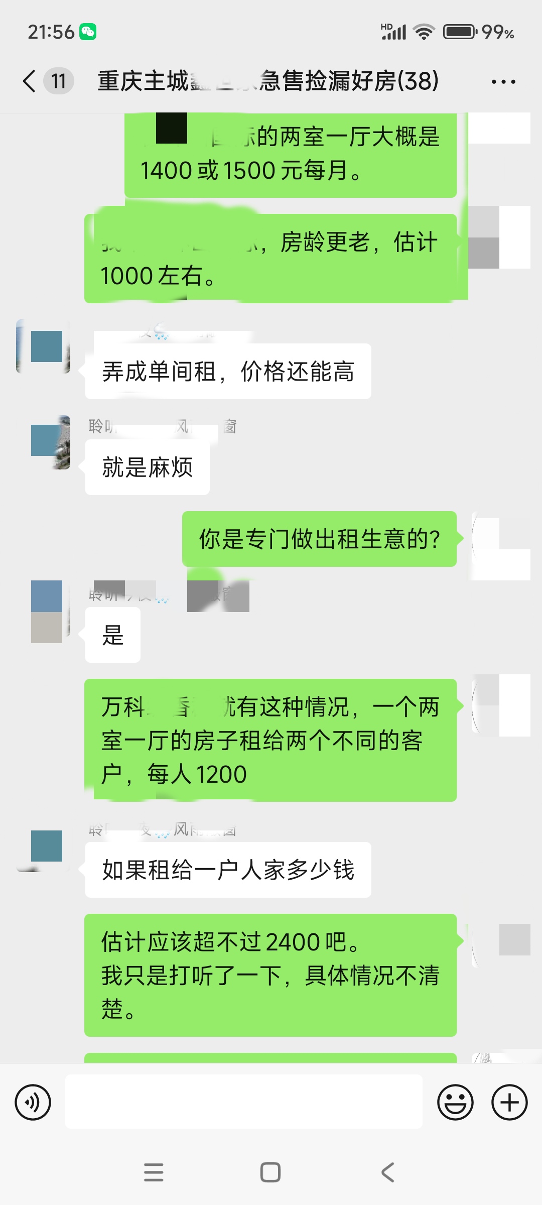 跟亲戚打听了一下,他们小区(渝中区某某朗庭)有月租2600的房子,不过售价在100万左右,