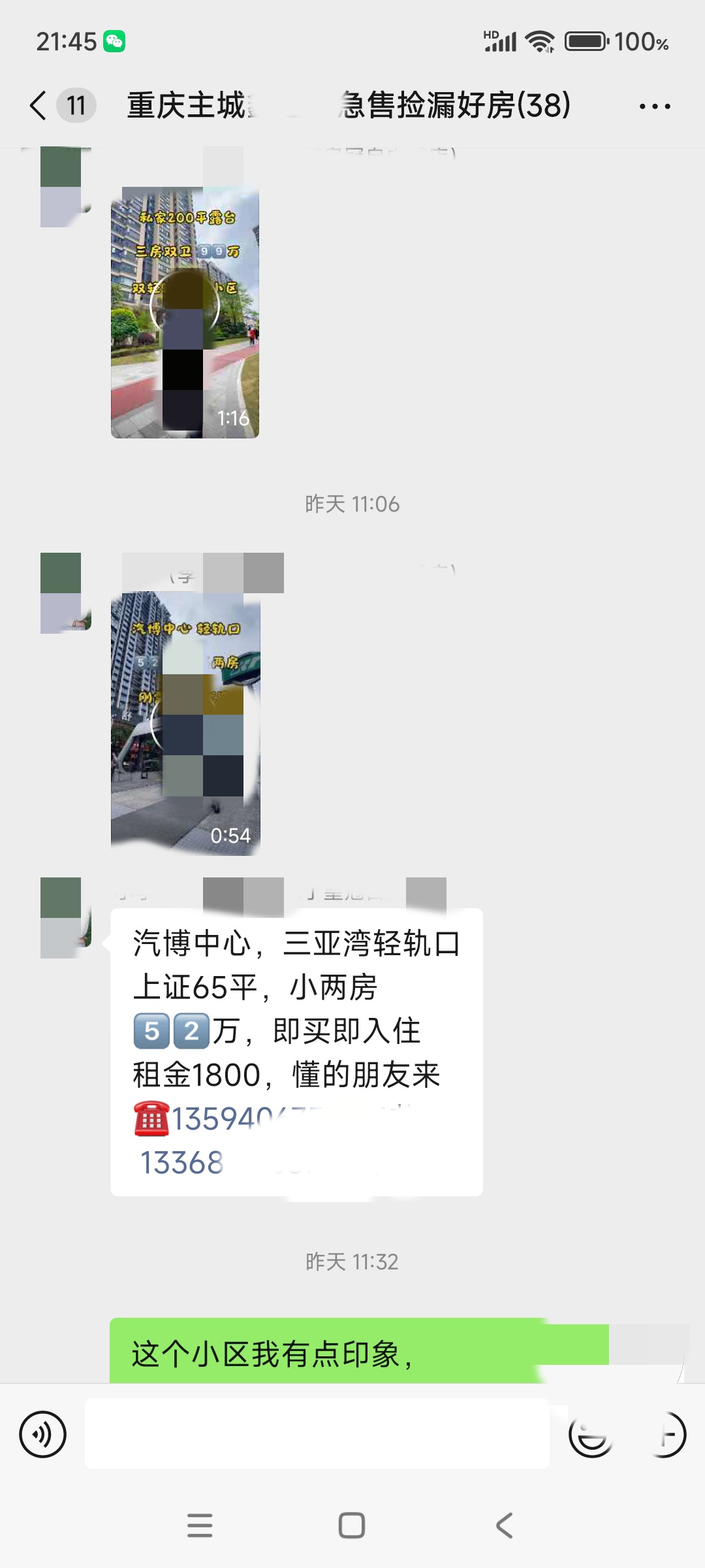 第2个是重庆,我本月1号,跟中介去看了“某某国际”小区的房子,70多平米的两室,6楼,出租状态,挂牌价60多万,