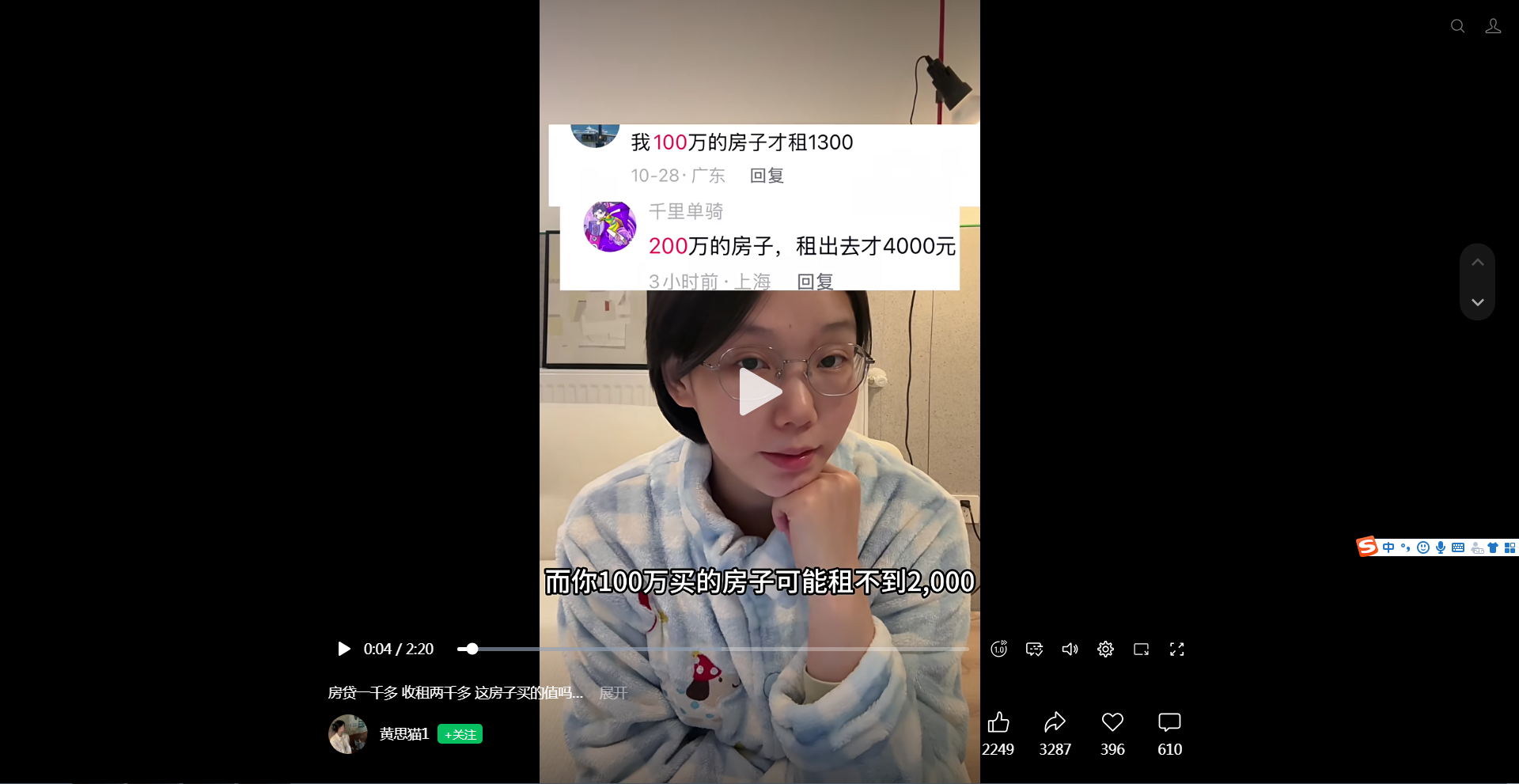 跟成都这个女性买家的数据对比,看来要么是重庆的房价偏高了,要么是成都的租金偏高了。