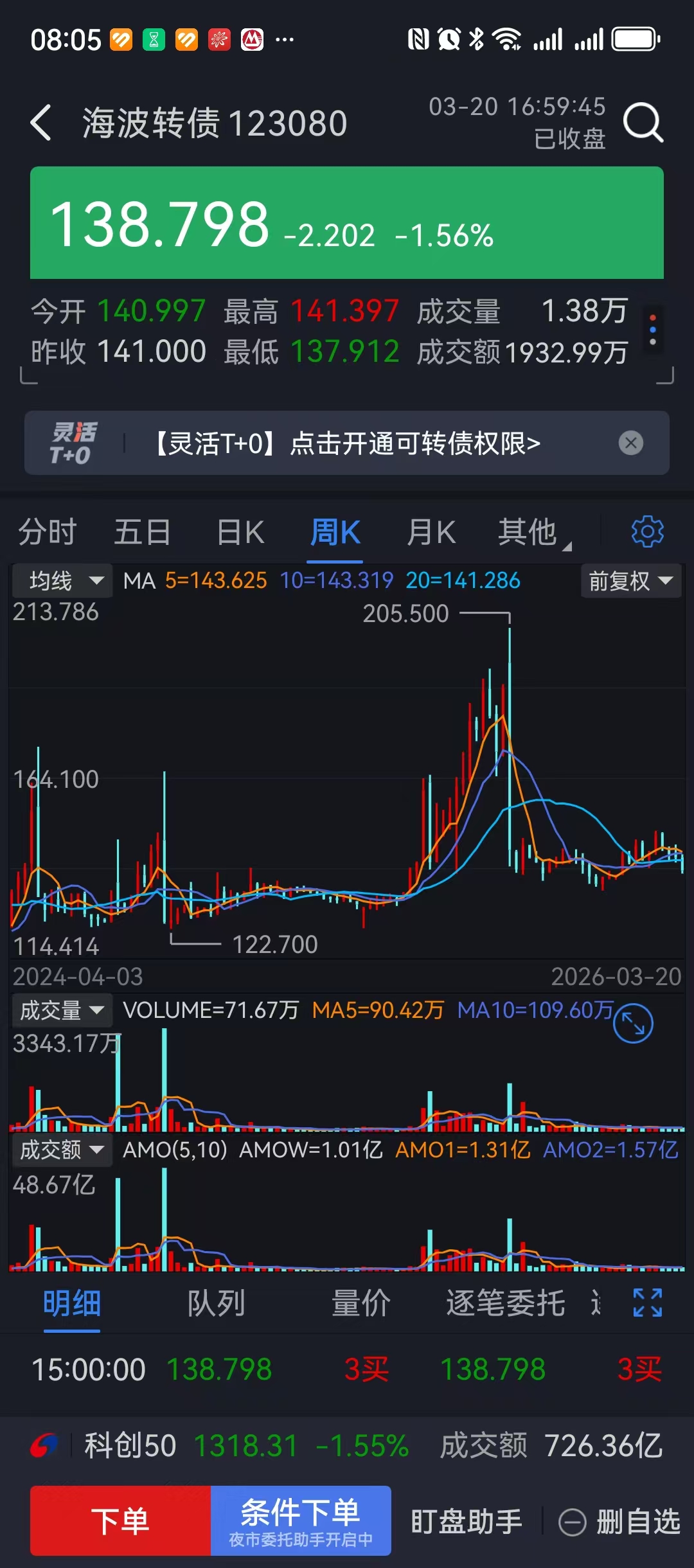有朋友问海波转债如何操作,目前的情况下,这货盘子小,历史上有多次冲高记录,后面还有没有机会冲高,也不好说,只能先靠熬,同时要有个心理准备,接受不是所有的品种都能赚钱..