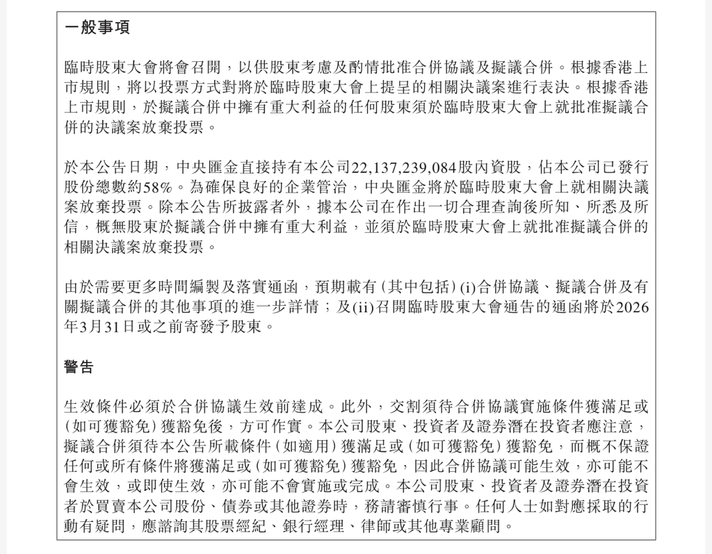 合并进度不及预期?!———————————————刚才读了中国信达的《公告-有關擬議合併的可能非常重大出售事項及非常重大收購事項》,其中提到:「預期載有⋯⋯召開臨時股東大會通告的通函將於2026年3月31日或之前寄發予股東。」截至目前,在港交所披露易上仍未查询到相关通函,或表明合并进度不及中国信达董事会的预期。是不及预期。我猜测应该是推迟到4月7日至10日之间召开二董。