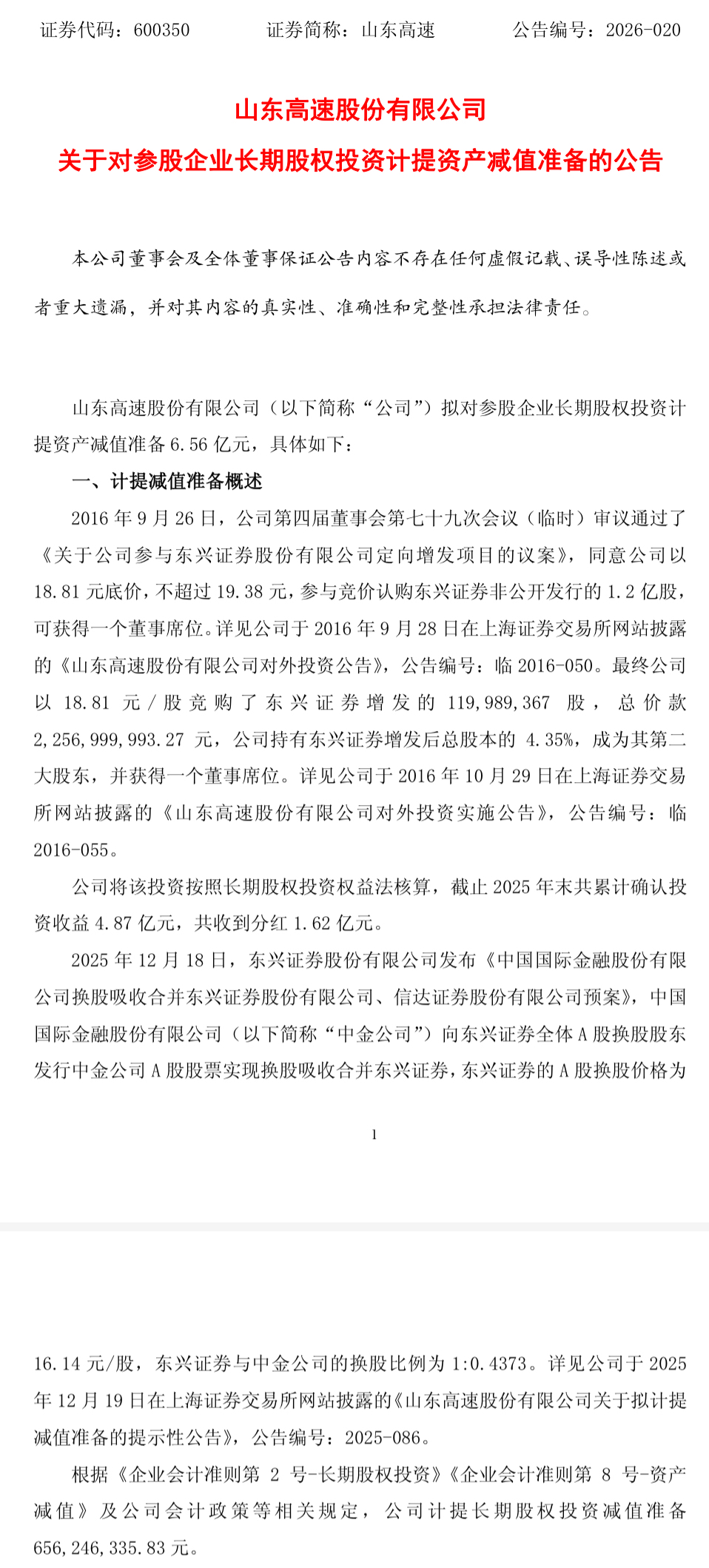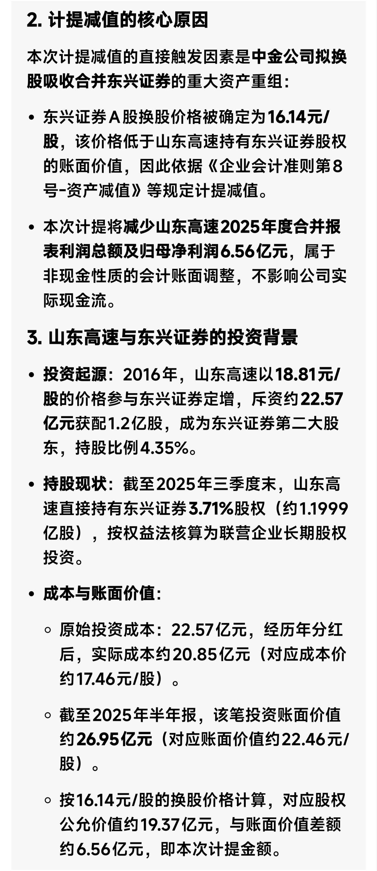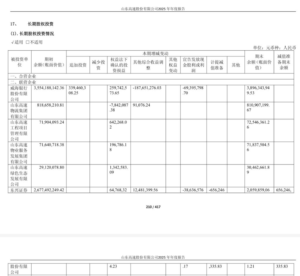 投资后东兴证券历次派息0.15、0.15、0.11、0.14、0.17、0.26、0.05、0.102、0.054、0.09、0.076、0.09元/股,合计1.442元/股,山东高速共收到173024667.214元分红。