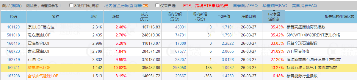 2026/3/27早:个人操作策略:油价长期看涨,交易所管控的前提下,活跃的高溢价油气品种T+0风险变大,说关小黑屋就关进去了,不能碰! 162411或163208两只低溢价的票: 6成左右仓位,留好现金以应万变。