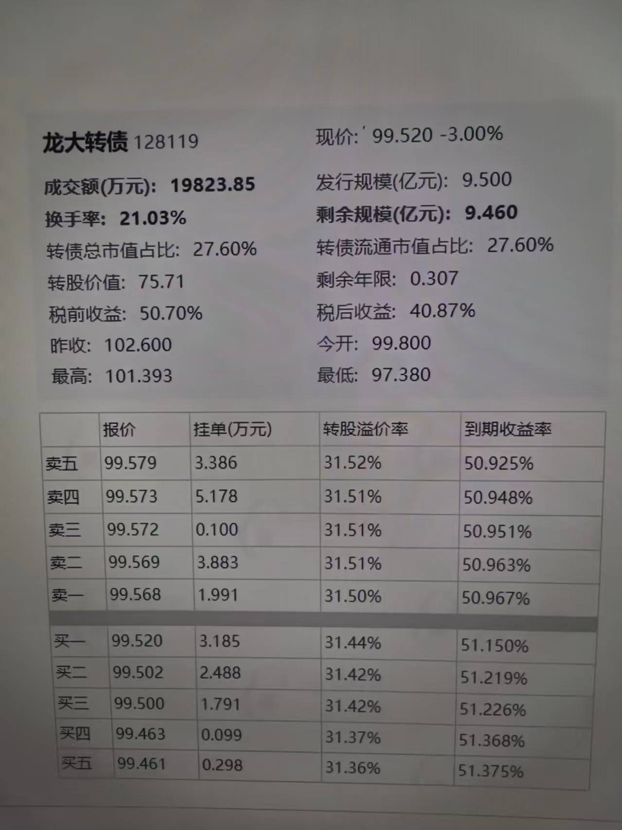 龙大转债,全市场价格最低品种,3个月到期,到期收益超50%,这个肯定有违约风险,要不然不是这个价格;以当前的价格参与小额并不合适,其实从根本上来说,不建议参与任何小额...