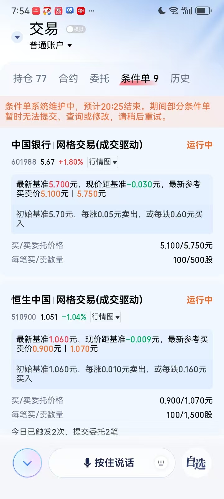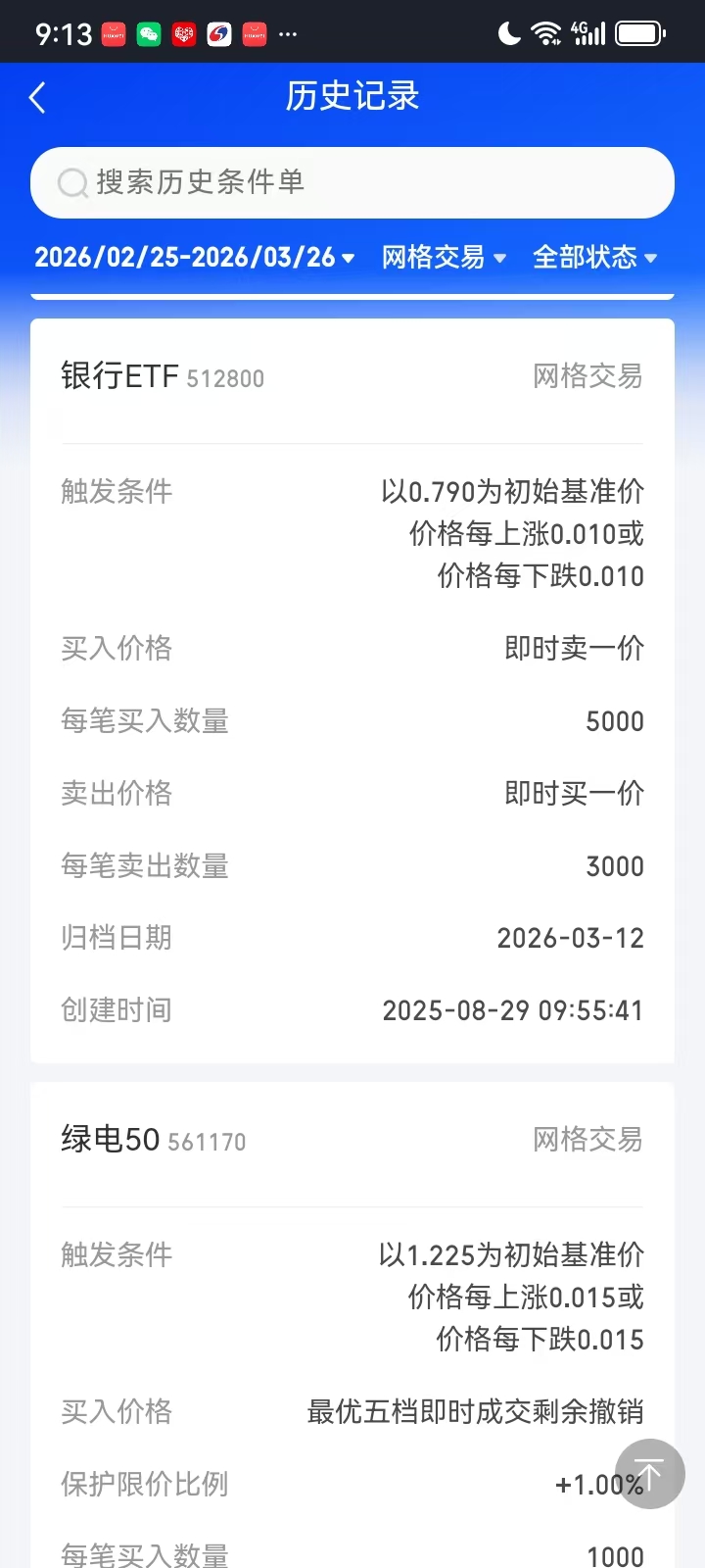 智能条件单的调整(修改)的实例。我是一个银粉,华泰的一个账户持有数量较多的512800银行ETF,而且持仓成本较低,从2023年6月开始设置网格条件单自动成交。因为是到价触发型,2025年8月29日设置的价差是0.010元,委托数量买入5000份,卖出3000份。2026年3月12日设置成交驱动型网格条件单,价差是0.005元,委托数量买入2500份,卖出1500份。2026年3月23日买入成交...