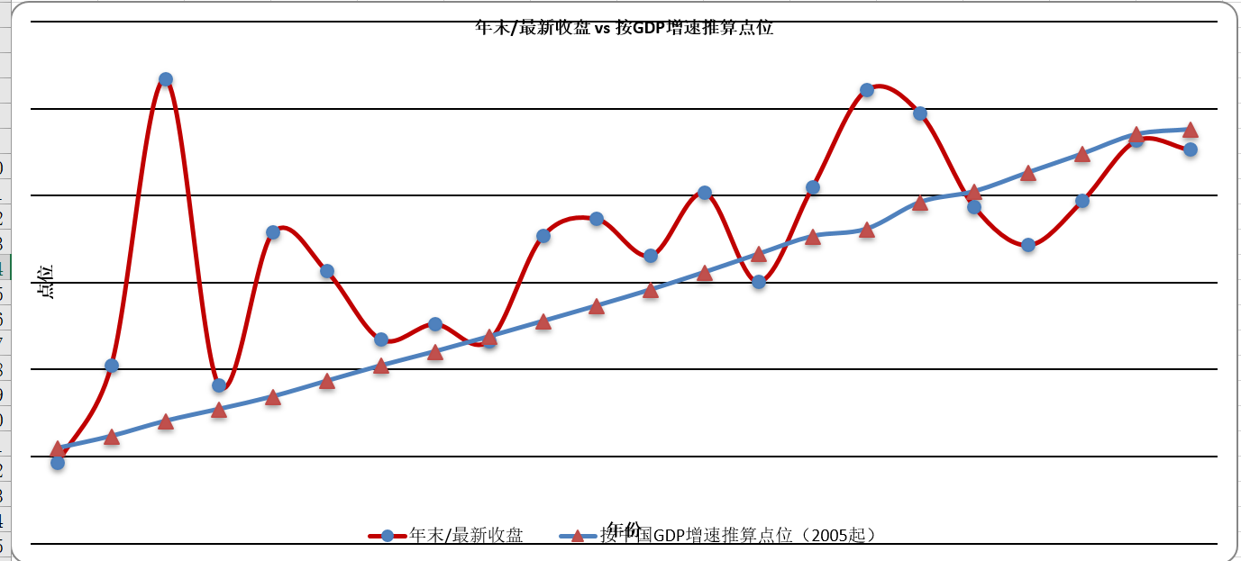 因此我就想到沪深300基本上是中国最大的一批上市公司,甚至可以去掉上市两字,他们的正常涨幅应该可以跟GDP差不多(假设GDP是社会平均增幅),结果还蛮有意思,发现以05年年初开始,每年末按GDP增幅计算出来的年末点位和每年末实际点位存在很紧密的支撑性,基本上如果那些年年末点位超过我设定的估值锚%过多时(超过20%,近的年份超过15%),下年末开始投的话,年化数据都不咋滴。