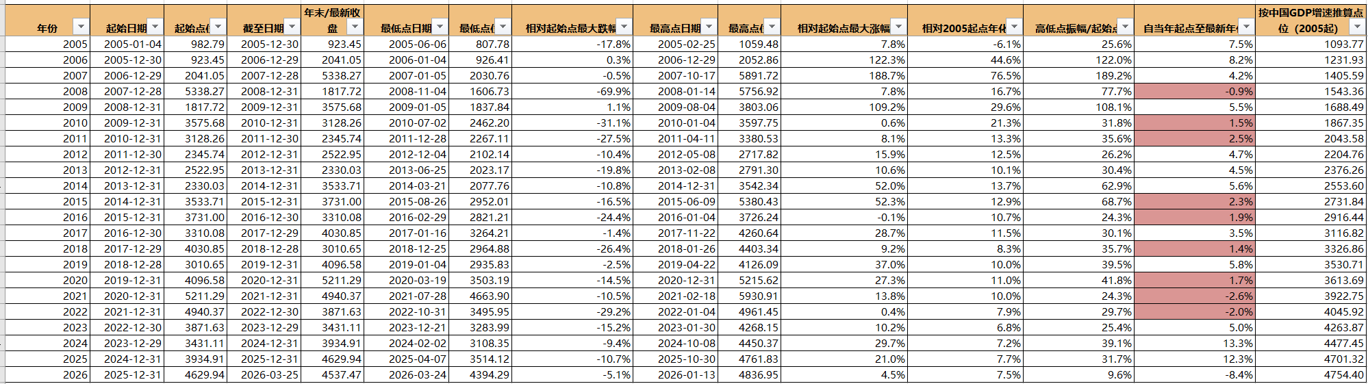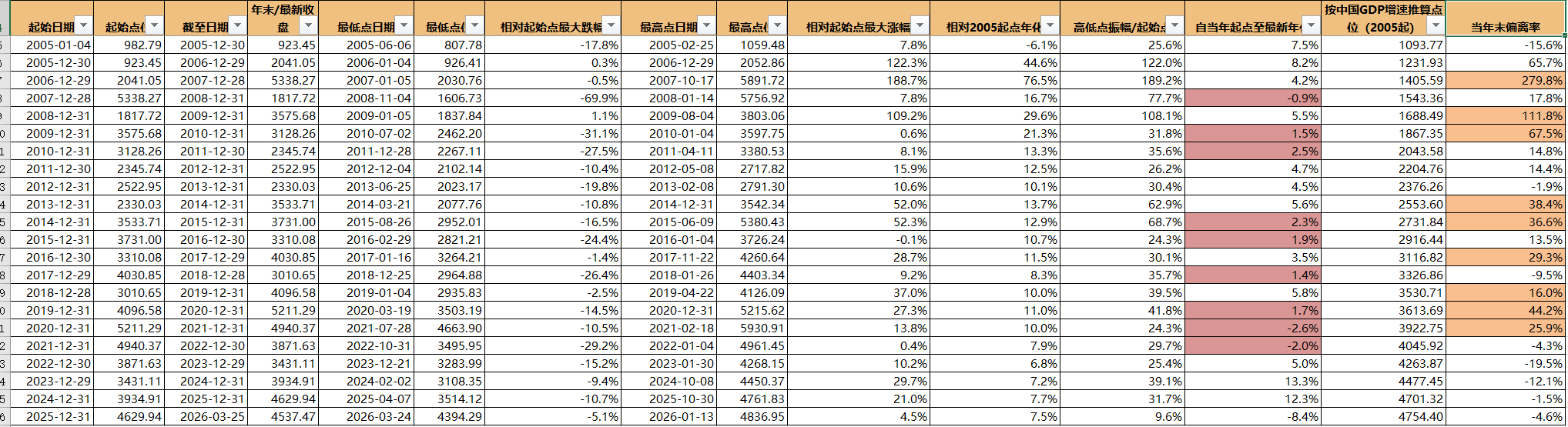 然后我就在想,沪深300指数到底怎么样才算合理的价格,我让AI跑了从05年指数上线时点到现在每年的点位变化,包括振动幅度,确实基本上振幅有没有低于20%的,然后我也让跑了从05年开始投资,到每年年末的CAGR,以及假设每年起点开始投资,到现在的CAGR有多少。