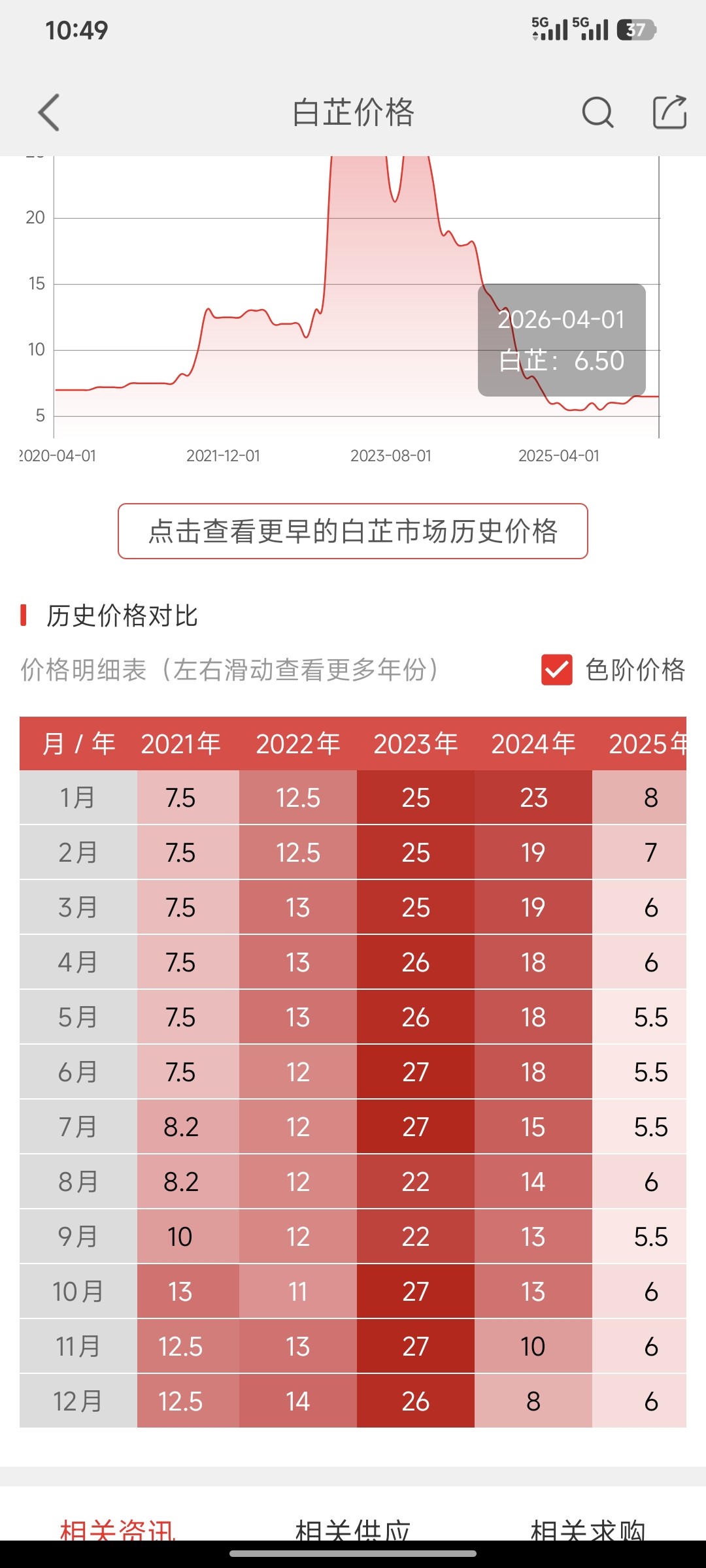 我给你分享一下我是如何看图分析得出今年不会涨的结论的。首先我通过图片分析出的规律是每年三月的价格变化预示着当年的价格走势,三月价升则全年价升,三月价平或降则全年平或降。再联系实际分析,每年三月应该就可以调查出当年的种植情况,预判产量(天气也不是不能进行预测)、成本。在需求量变化不大,掌握全国仓储库存情况的话,某些专业机构或组织就可以决定是否开始囤货了。除非药厂的采购时间有特定规律,不然无法解释这种价格变化规律。
