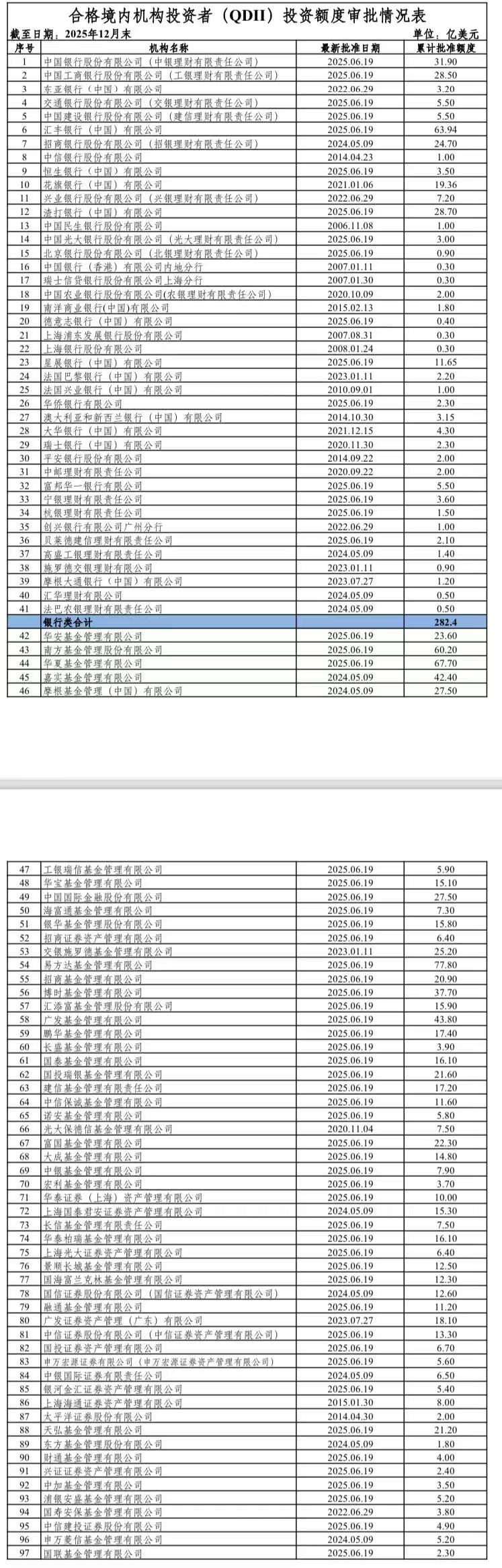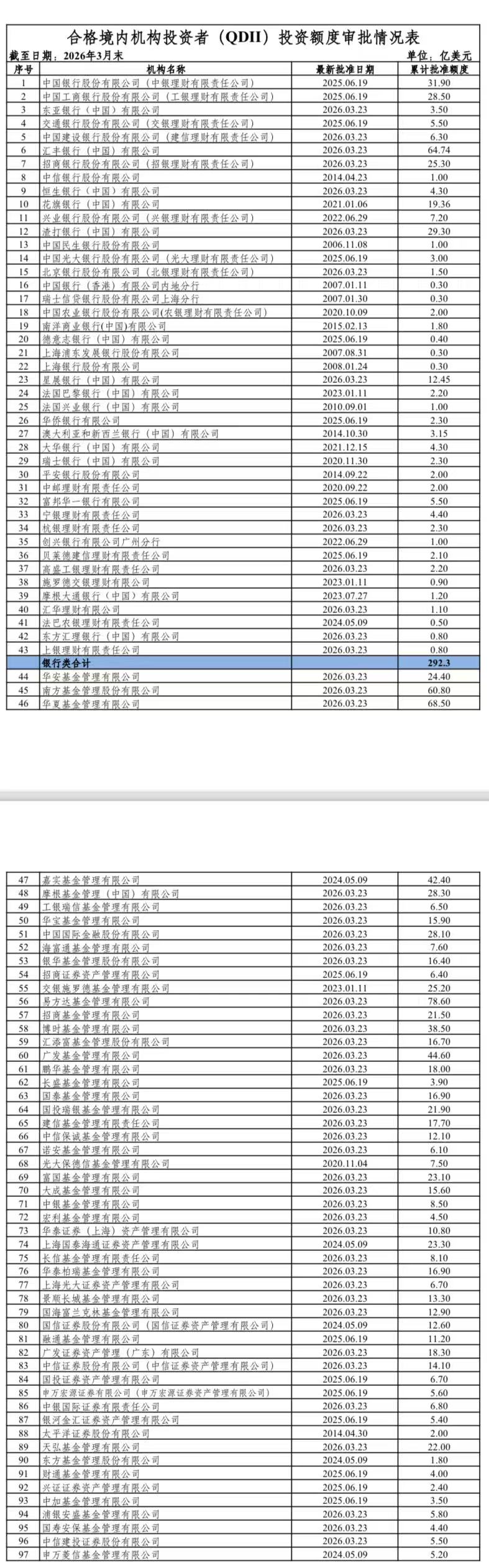2026年3月,合格境内机构投资者(QDII)投资额度新增53亿美元,其中47家基金、券商合计额度新增29.9亿美元。