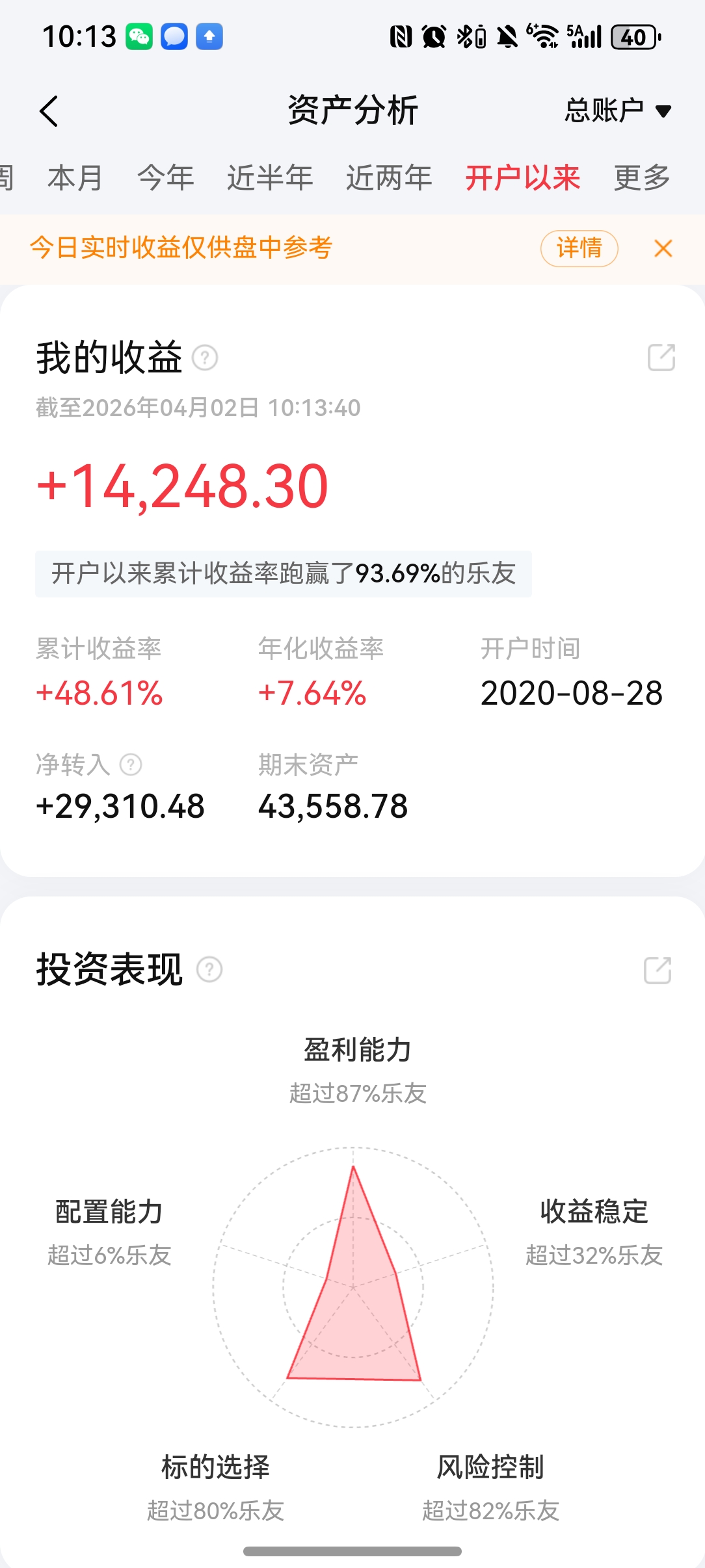 累计收益 +48.61%,年化 7.64%,跑赢 93.69% 投资者。