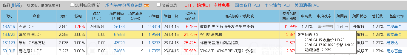 您好,162719 的“参考标的期间涨幅”那里是不是有错误,居我观察“道琼斯美国石油开发与生产指数”应无此神勇之表现。所以,连带这“T-2日溢价率”是不是也错了?