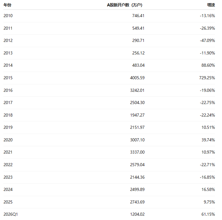 其中 2010—2025 是全年数据,2026 目前只能列到一季度(截至 2026 年 3 月);“增速”按同比计算。
