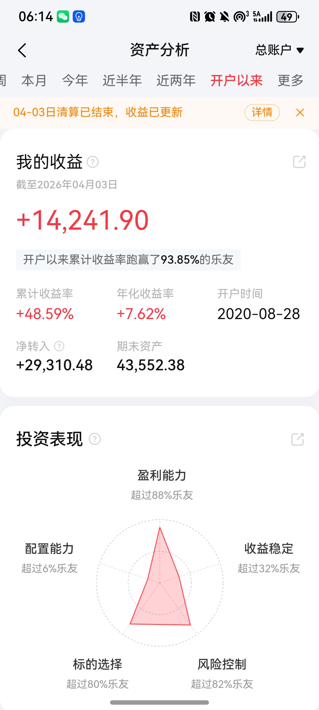 累计收益:+14241.90元,累计收益率 +48.59%