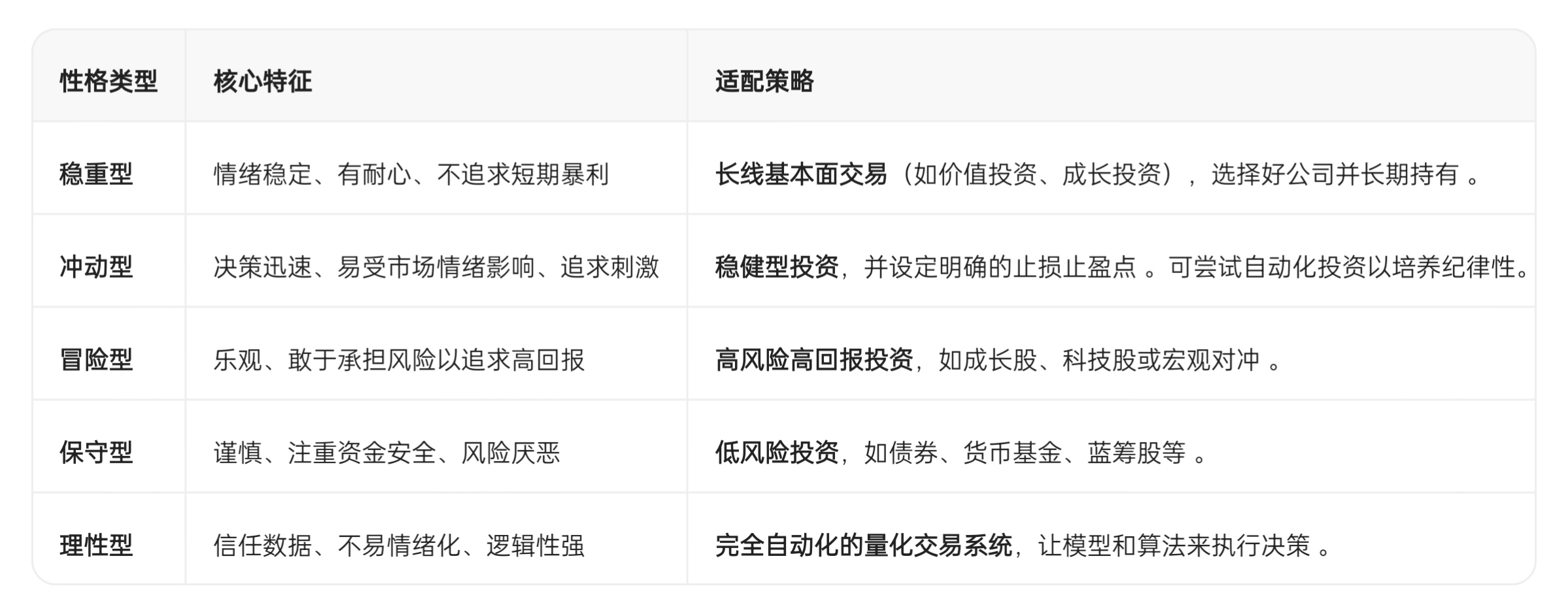 一个在历史回测中表现优异的策略,如果与你的心理承受能力、风险偏好和生活方式相悖,你很可能无法坚持执行,最终导致失败 。投资的本质是“认知 + 性格 + 策略”的结合,其中性格决定了你能承受的风险、能坚持的耐心和能守住的纪律。