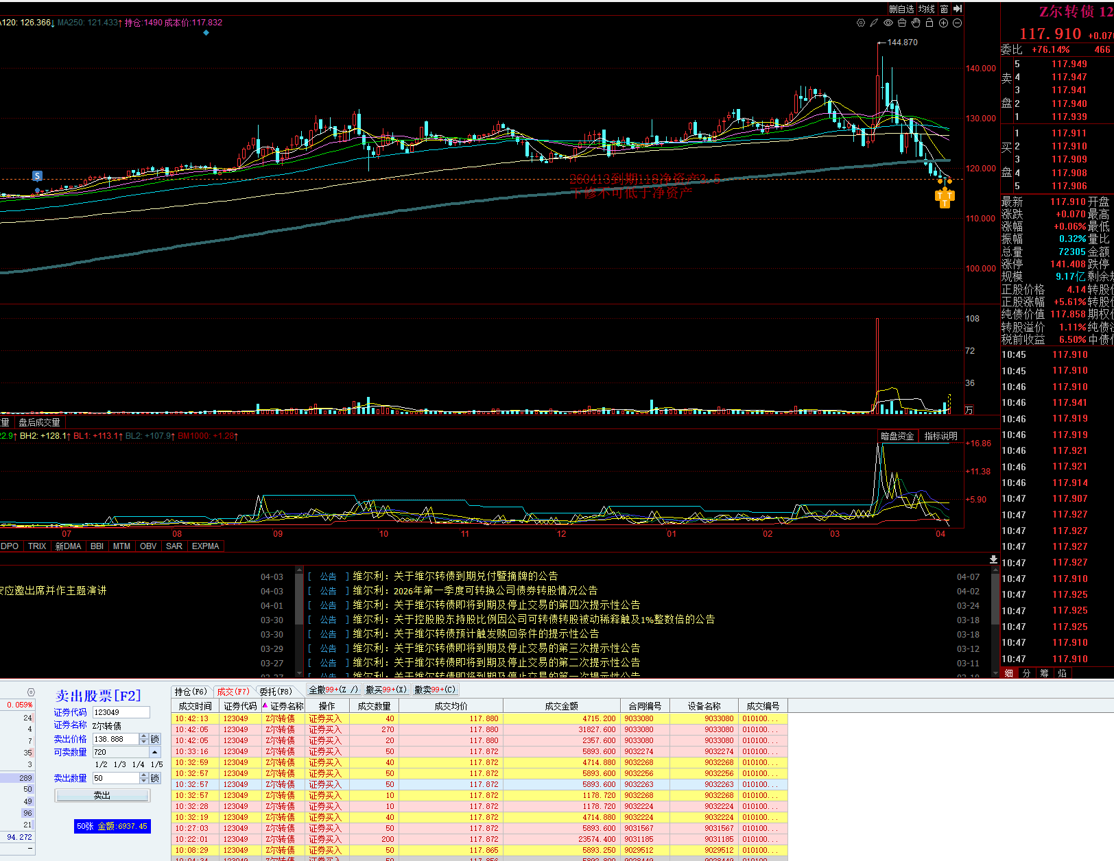 涨不上去预估收盘会在117.8左右吧,如果涨上去,估计折价率会两个点左右,大概,差不多,三五个点折价当然也有可能,不过看市场价格和账上的现金,不像还不起钱