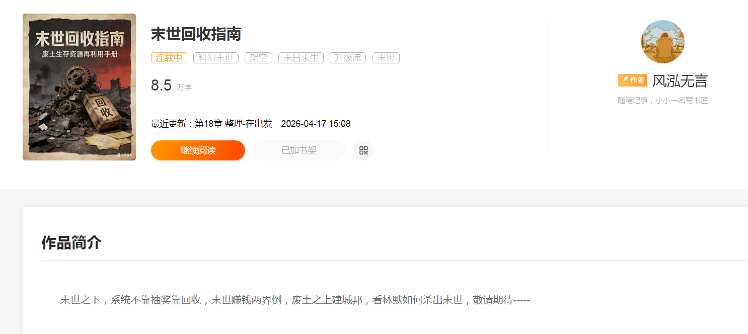 这几天,在番茄搞了《末世回收指南 》风泓无言。尝试一下。肯定有许多不足,希望感兴趣的提提意见。
