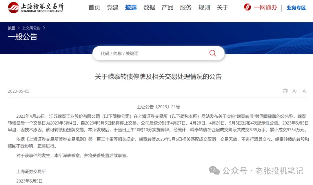 按照公告,嵘泰转债2023年5月4日是最后交易日,5月9日最后转股日,5月5日按例是应该停牌的,可是不知道什么原因居然正常开盘交易了。