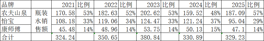 但真正的转折点发生在2025年。农夫山泉不仅实现反弹,瓶装水营收回升至187亿元,更以57%的三家相对市场份额刷新五年纪录。与此同时,怡宝却陷入颓势,营收骤减至95亿元,相对市场份额缩水至29%。