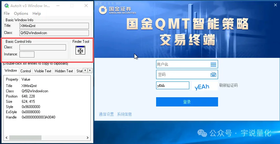 按照豆包给出的新代码,需要用 Au3Info.exe 在云桌面上查出账号、密码框的实际CLASS和INSTANCE。但我发现我找不到mini-qmt登录框的CLASS和INSTANCE!可以看到下图中红框里面Basic Control Info是空的。
