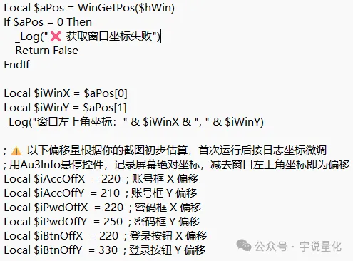 还是上一张图中,下面的Position是mini-qmt登录框左上角的坐标。所以在新的脚本中,先是调用WinGetPos方法获取登录框左上角的坐标,然后设置一个大概的偏移量,先执行一下看看能不能捕捉到登录框、密码框和登录按键,多试几次就能成功。